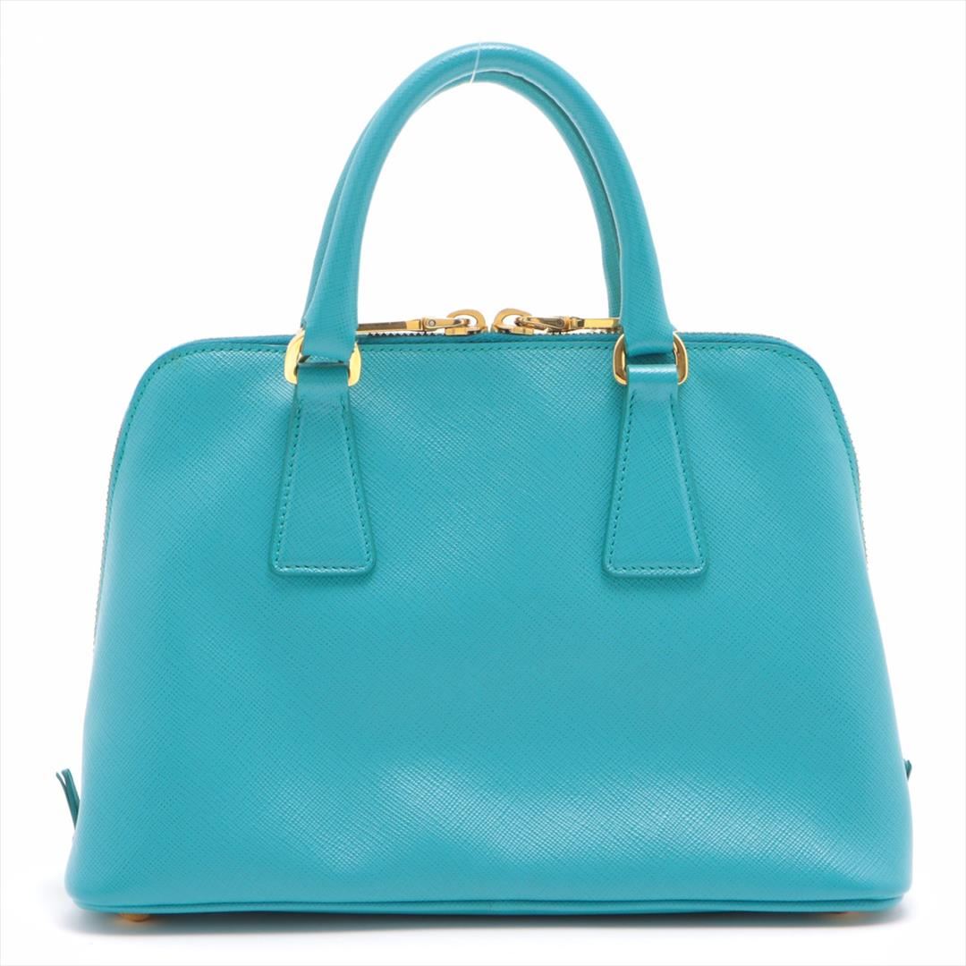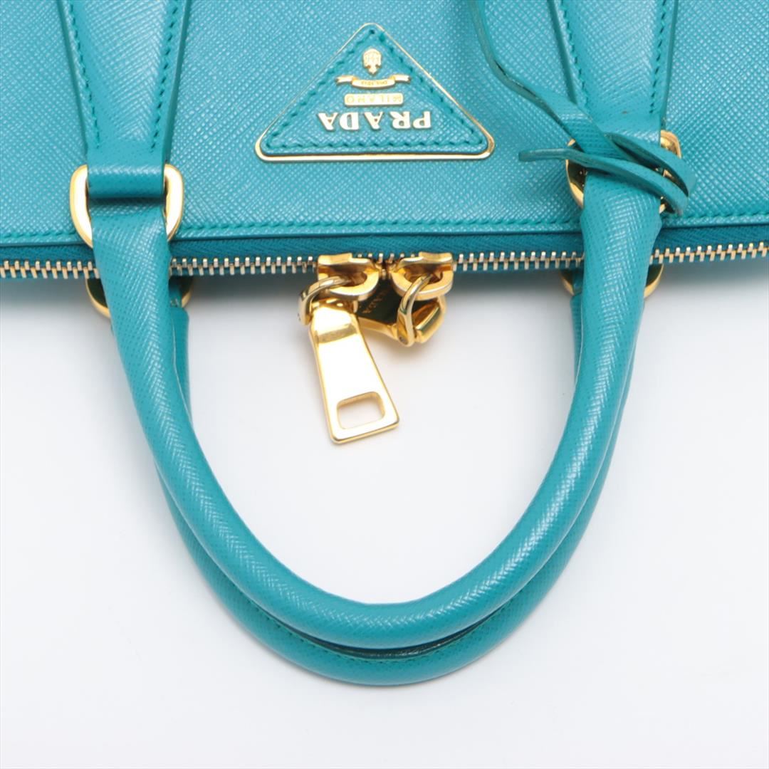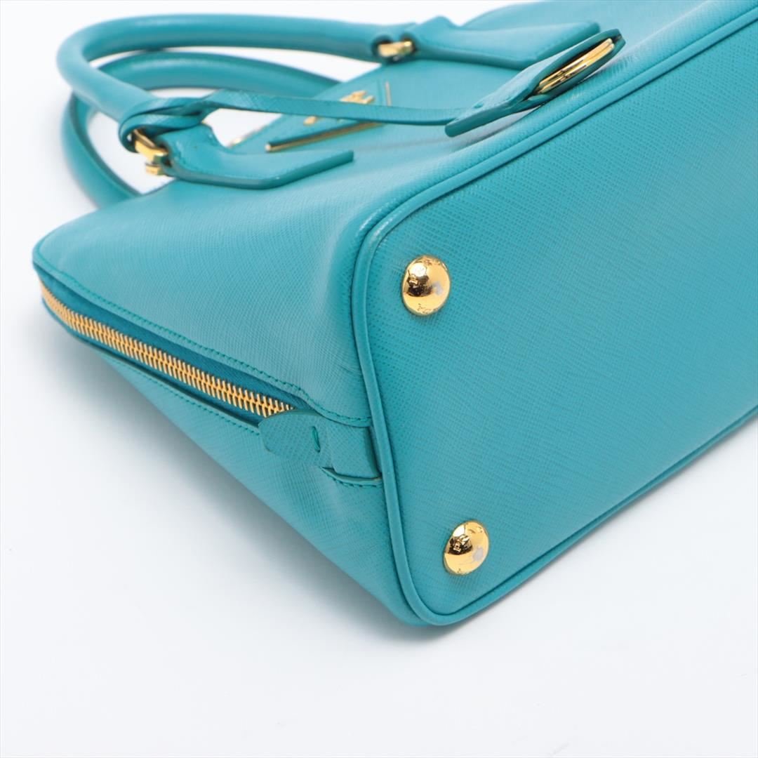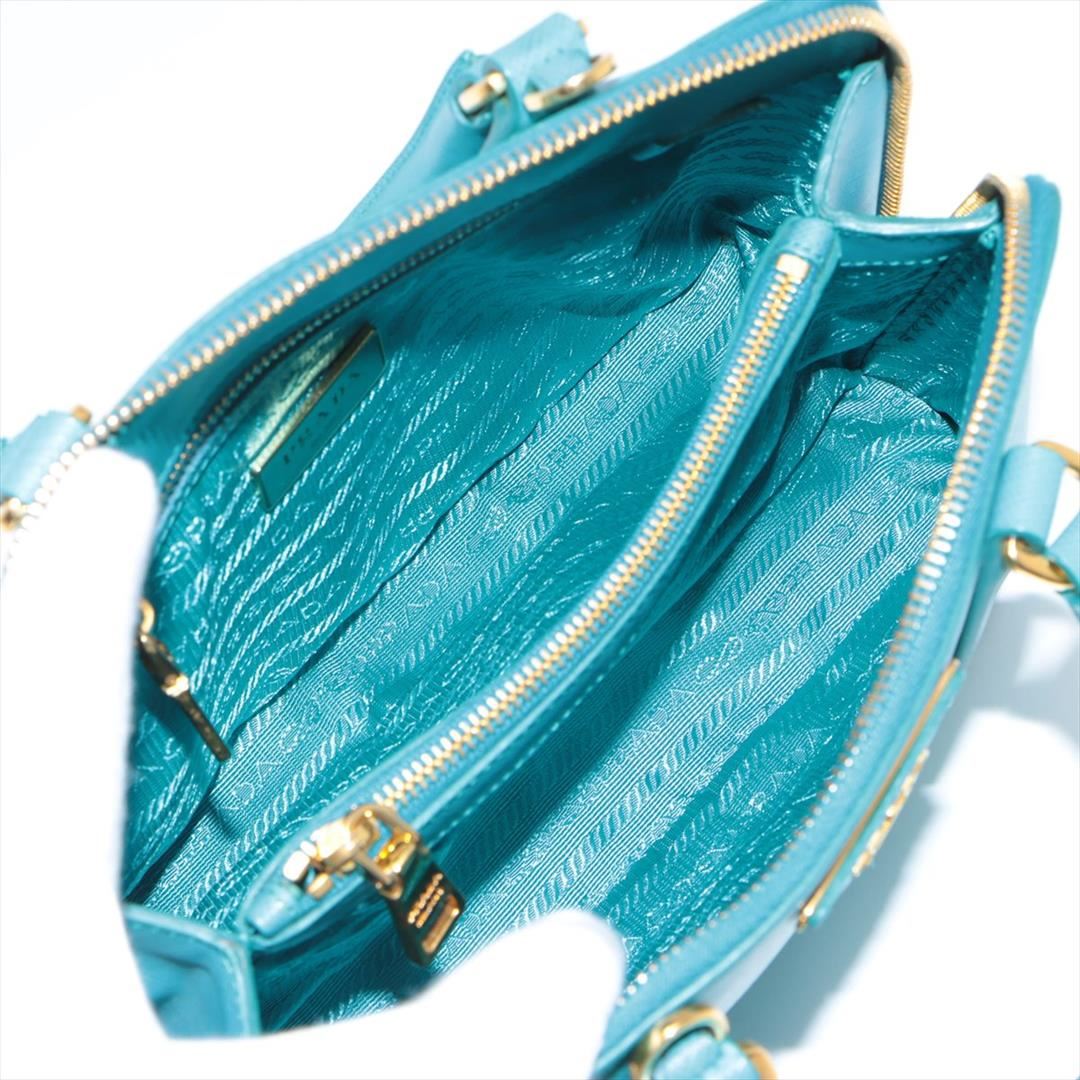 Turquoise Saffiano leather Prada Promenade Lux bag with gold-tone hardware, dual rolled top handles, detachable flat shoulder strap, tonal logo jacquard lining, single slip pocket at interior wall and two-way zip closure at top. W:25cm x H:18cm x D:11c
