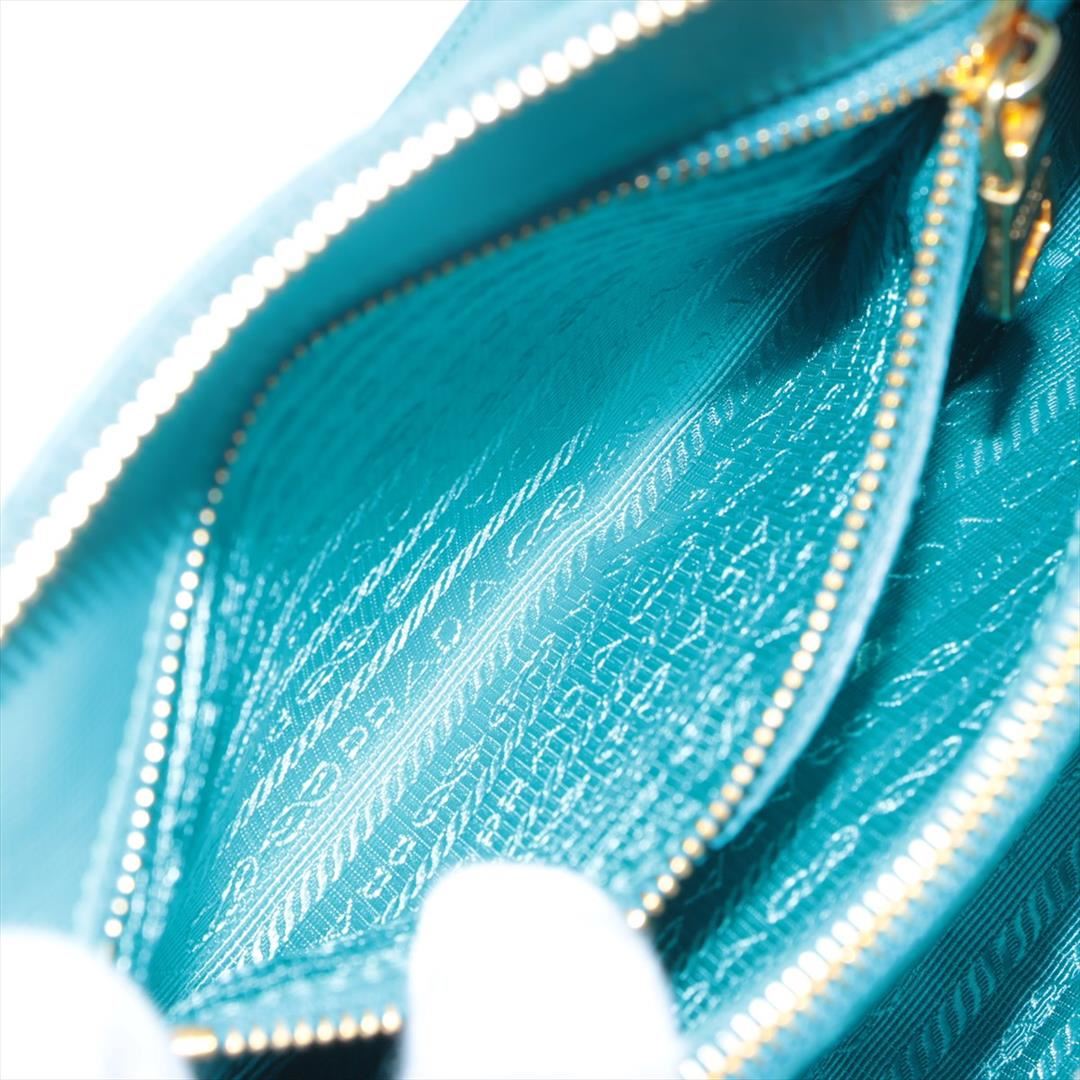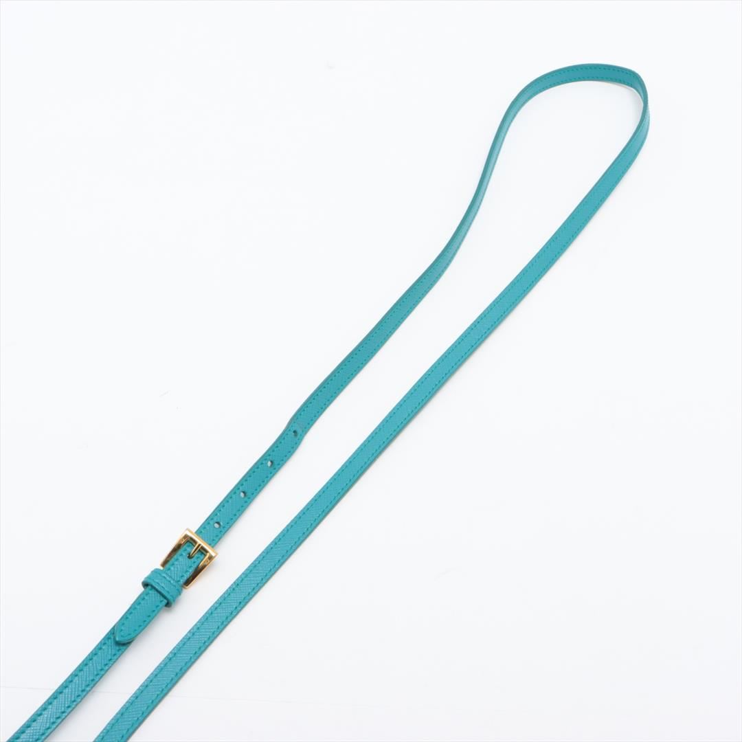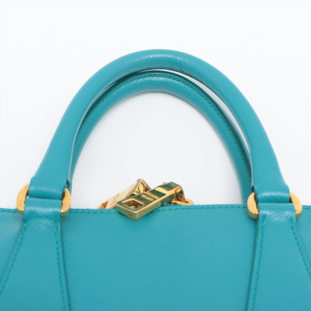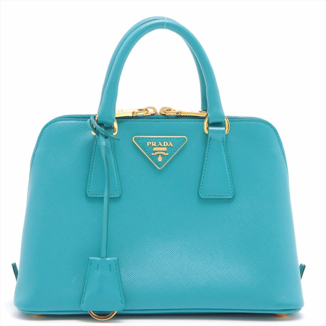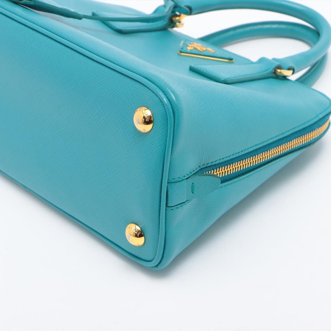 Turquoise Saffiano leather Prada Promenade Lux bag with gold-tone hardware, dual rolled top handles, detachable flat shoulder strap, tonal logo jacquard lining, single slip pocket at interior wall and two-way zip closure at top. W:25cm x H:18cm x D:11c