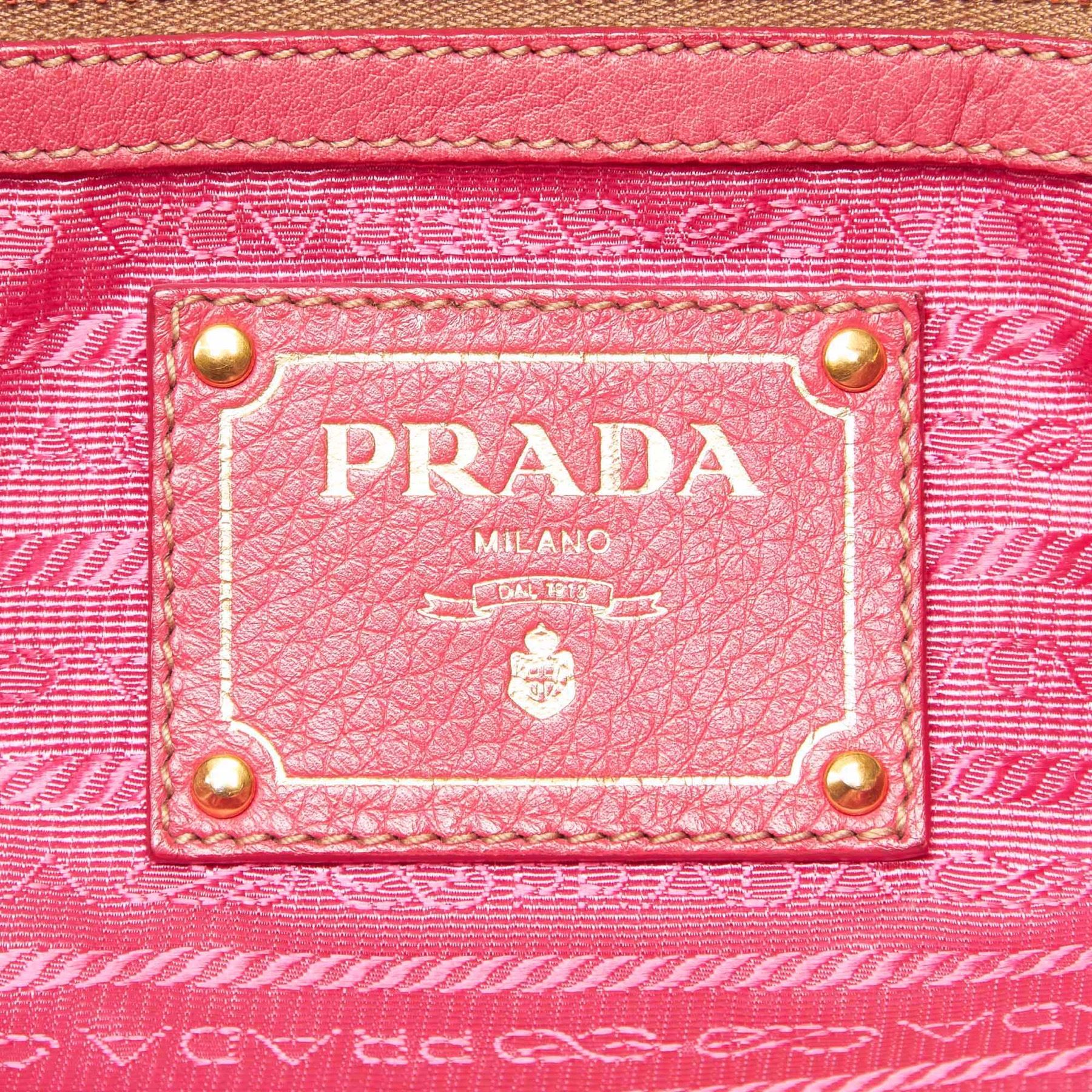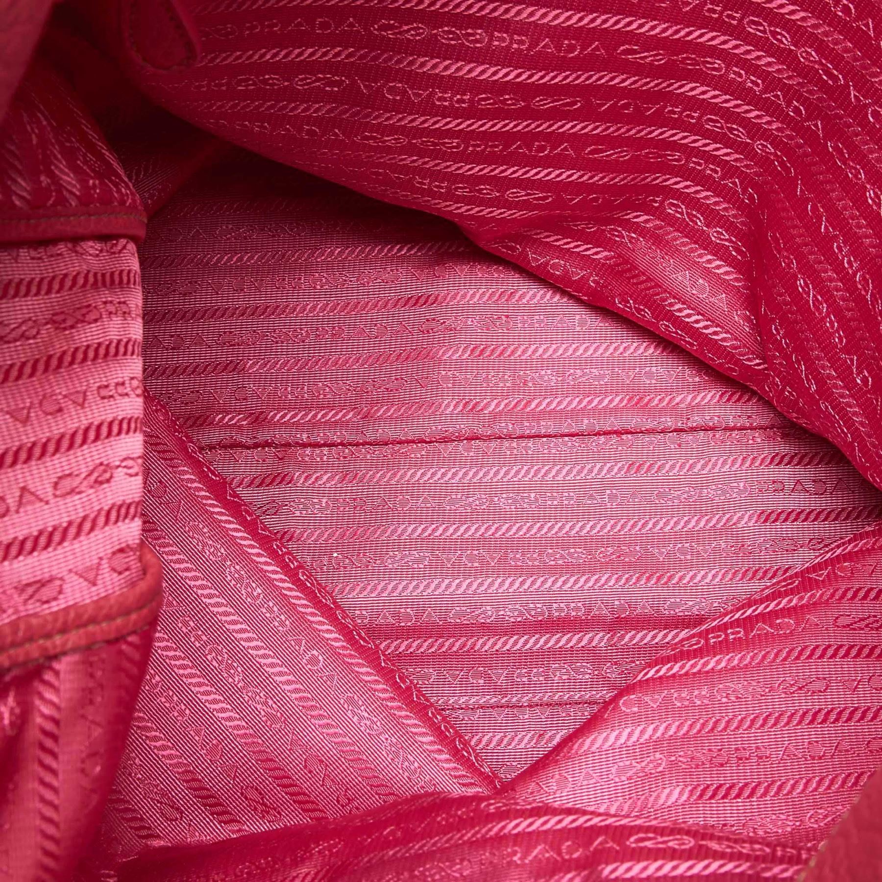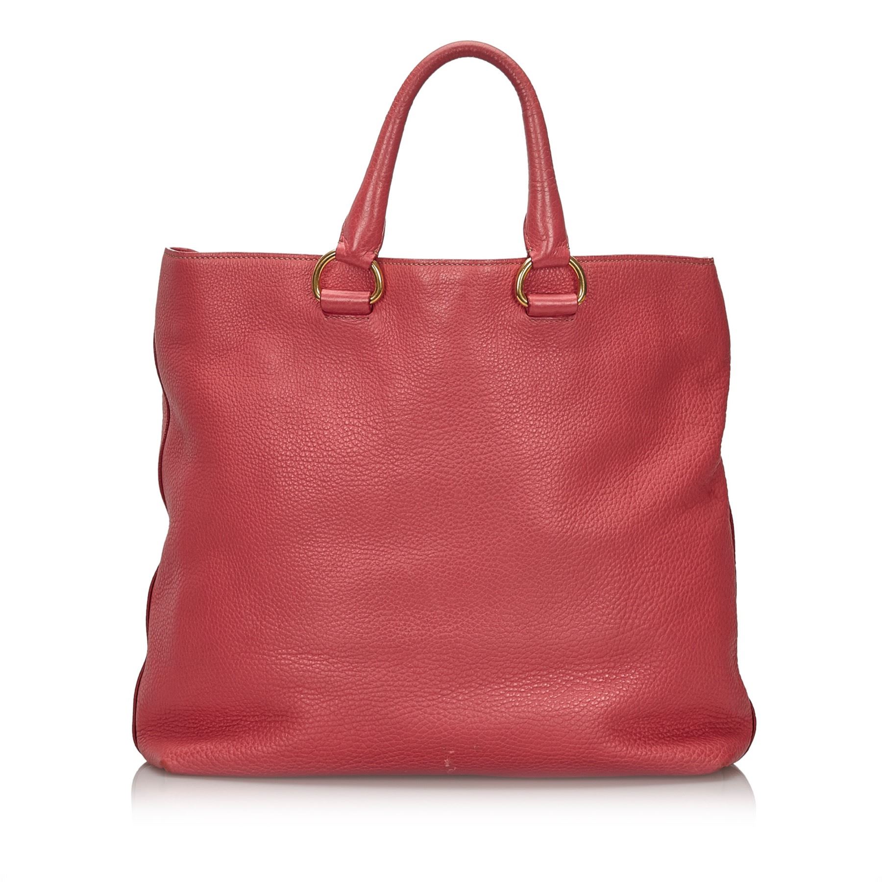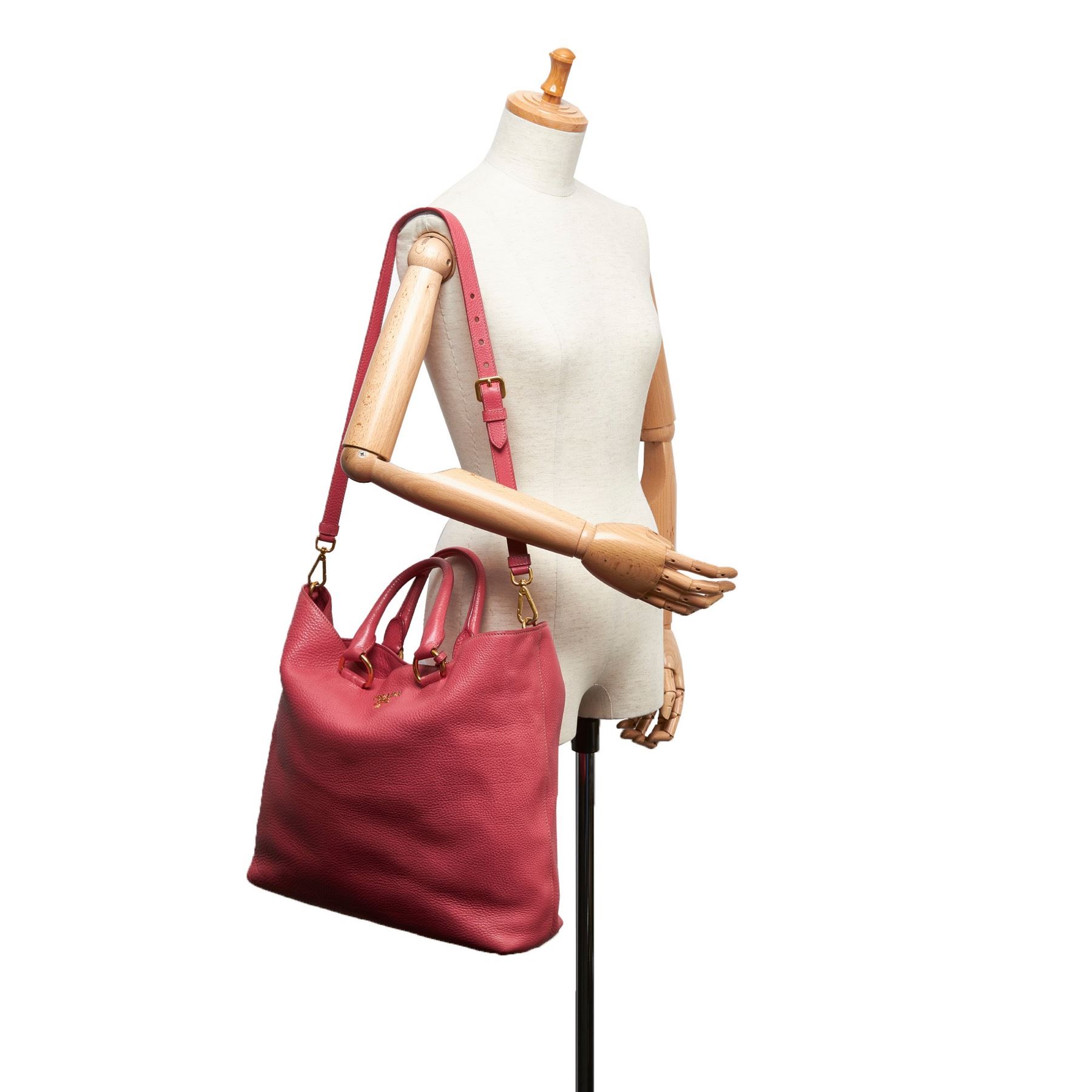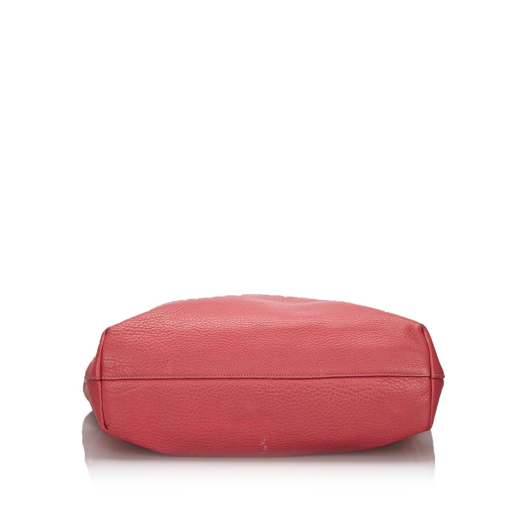 This satchel features a leather body, rolled leather handles, a detachable flat leather strap, an open top with a magnetic closure, and interior zip and slip pockets. Leather x Others Pink Exterior back is discolored and scratched. Exterior handle is stained. Exterior corners is loose stitching. Buckle is tarnished. Size: 33 x 42 x 14 Card: NO Made in: Italy