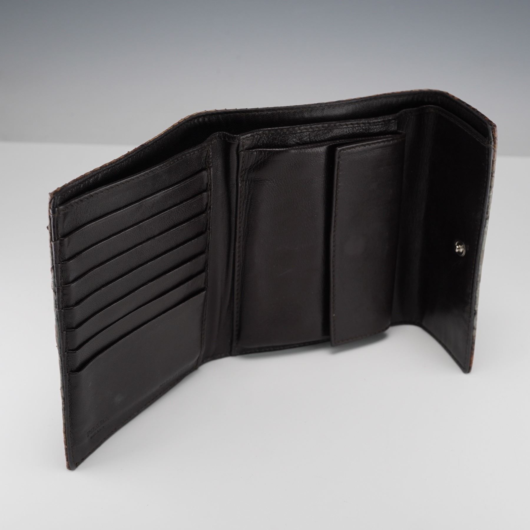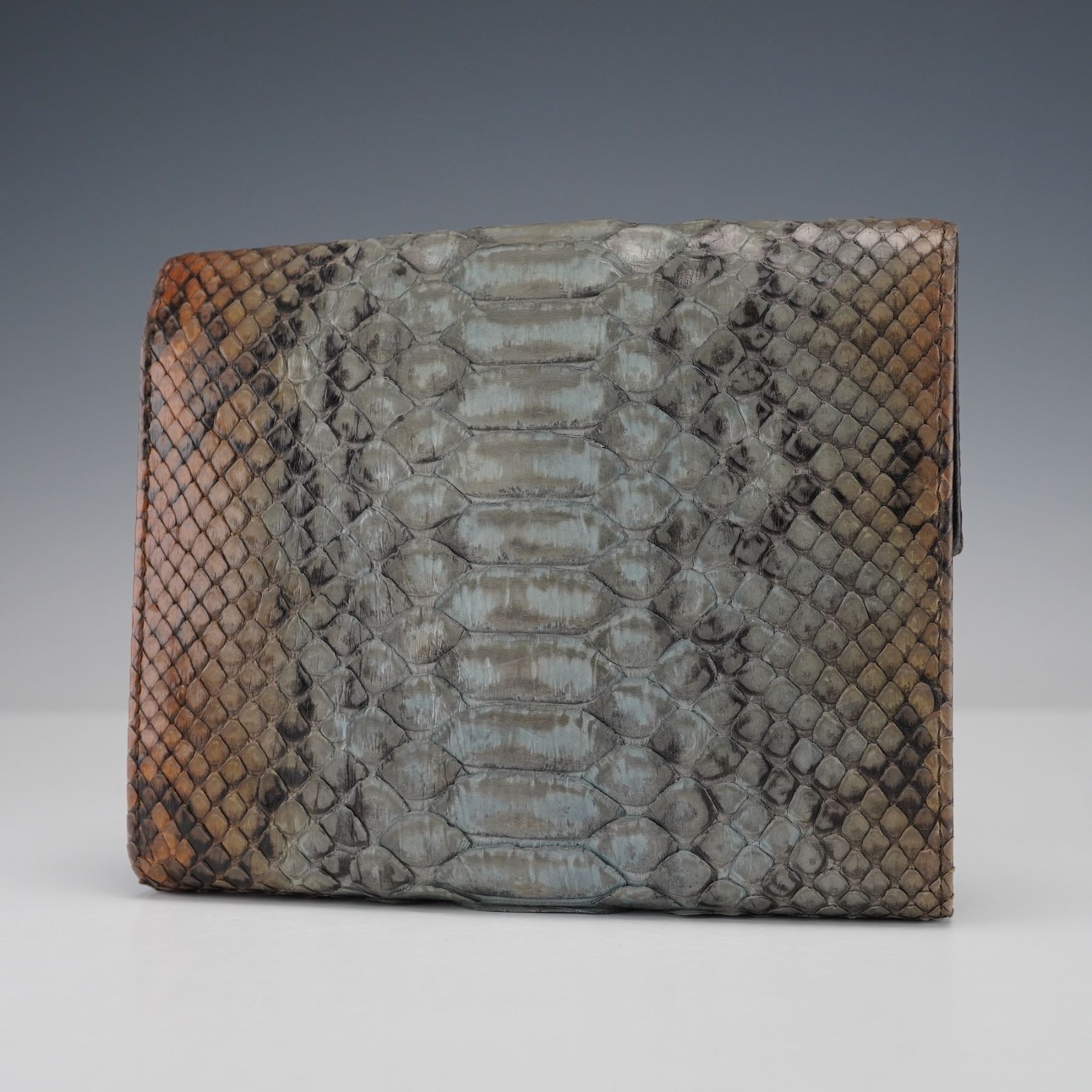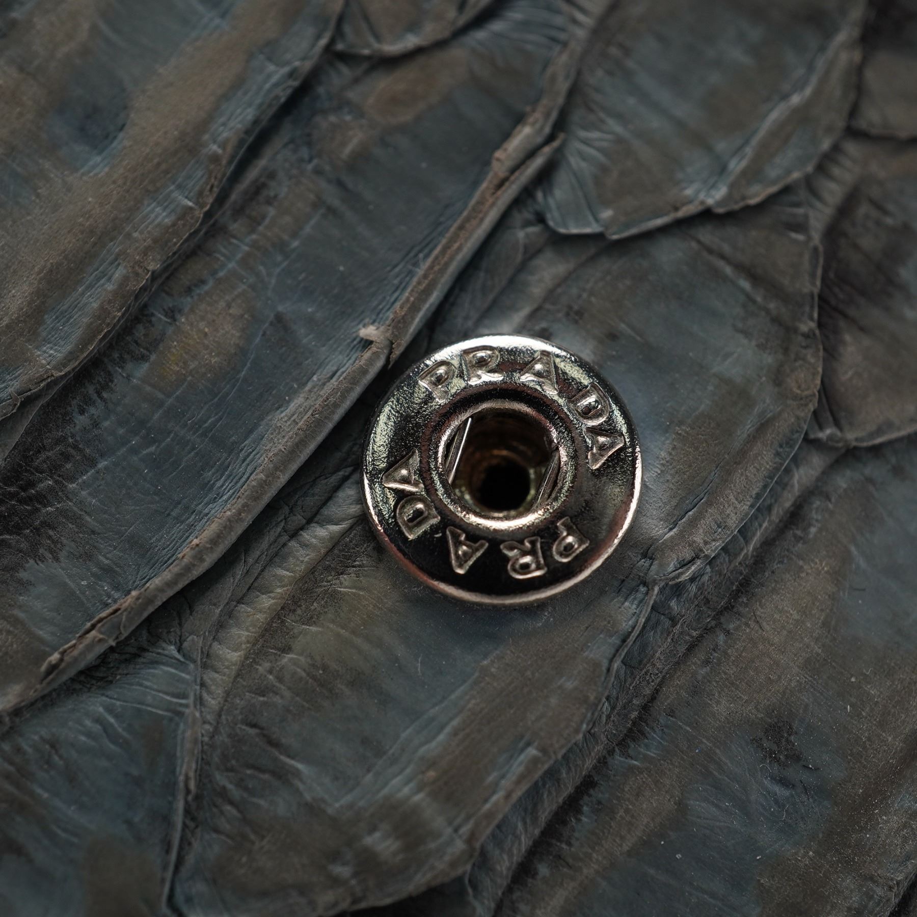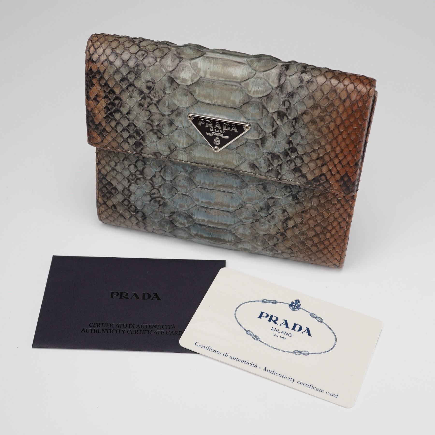 This Prada wallet, model 1M0170, is crafted from luxurious lizard skin in the Color Rock shade, featuring a sleek design with a Prada logo plaque. The wallet opens to reveal a well-organized interior with card slots and compartments. It includes authenticity certificate. Label LN 02904.