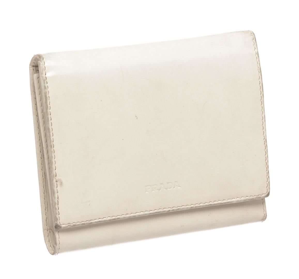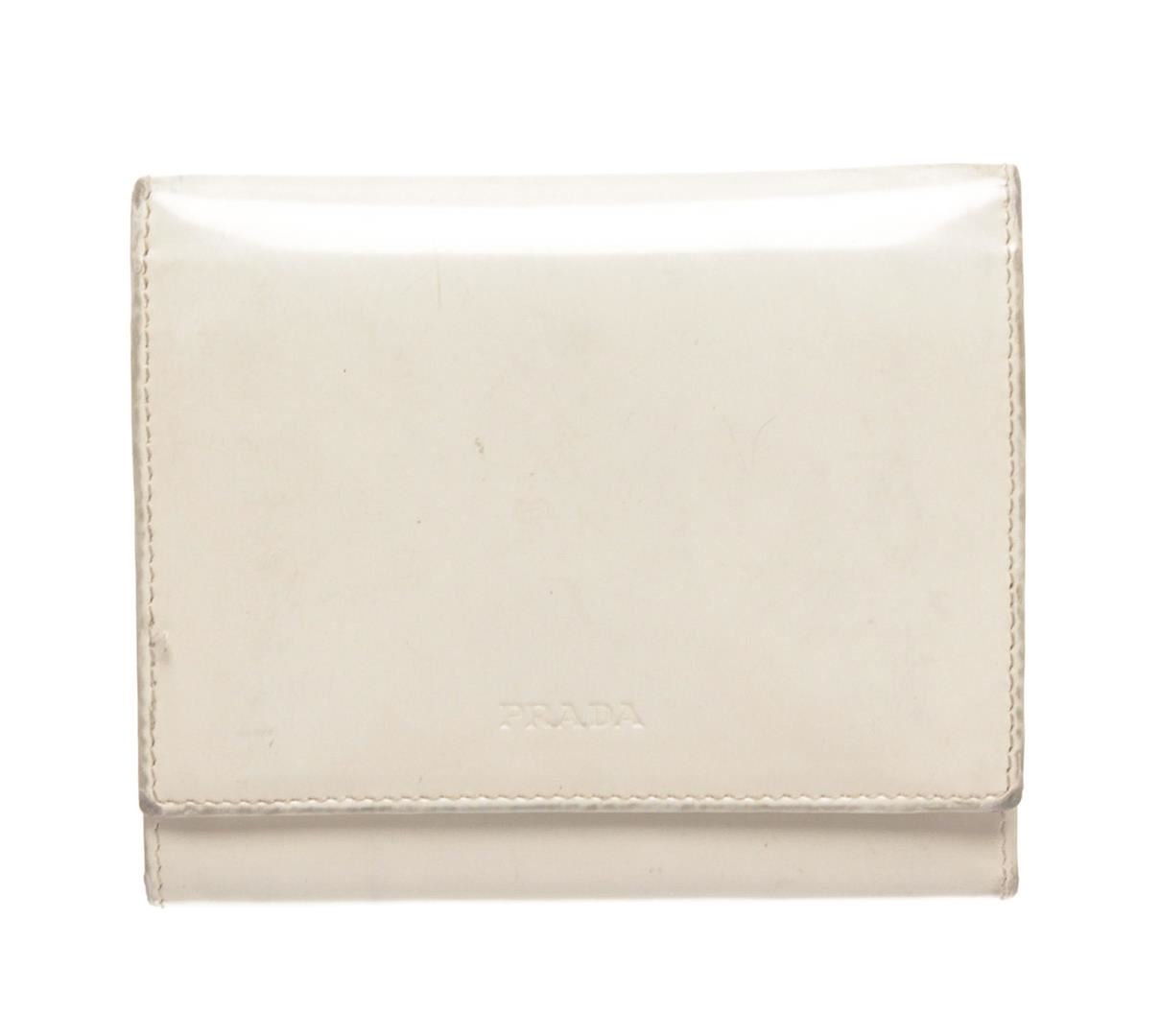 Prada white patent leather flap wallet with silver-tone hardware, interior bill pocket, three side pockets, coin pouch, six card slots, and snap closure.