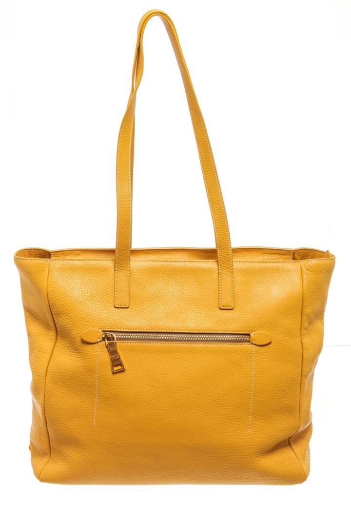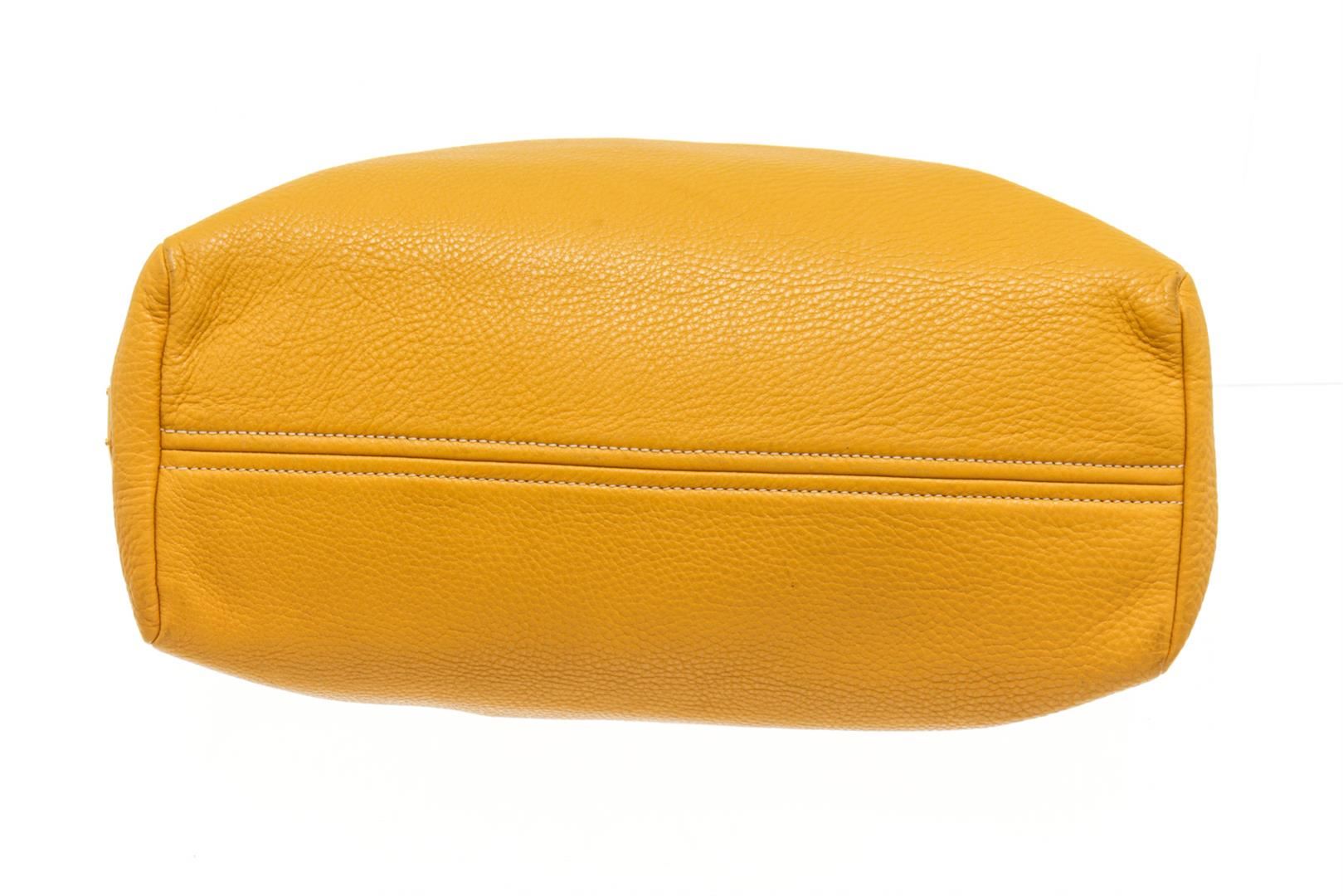 Prada Yellow Leather Front Pocket Tote Bag. All available information is listed in the description and shown in the photos. Prada Yellow Leather Front Pocket Tote Bag with shoulder strap, exterior zipper pocket, Prada fabric lining, interior slip pocket, gold tone hardware and zip closure.