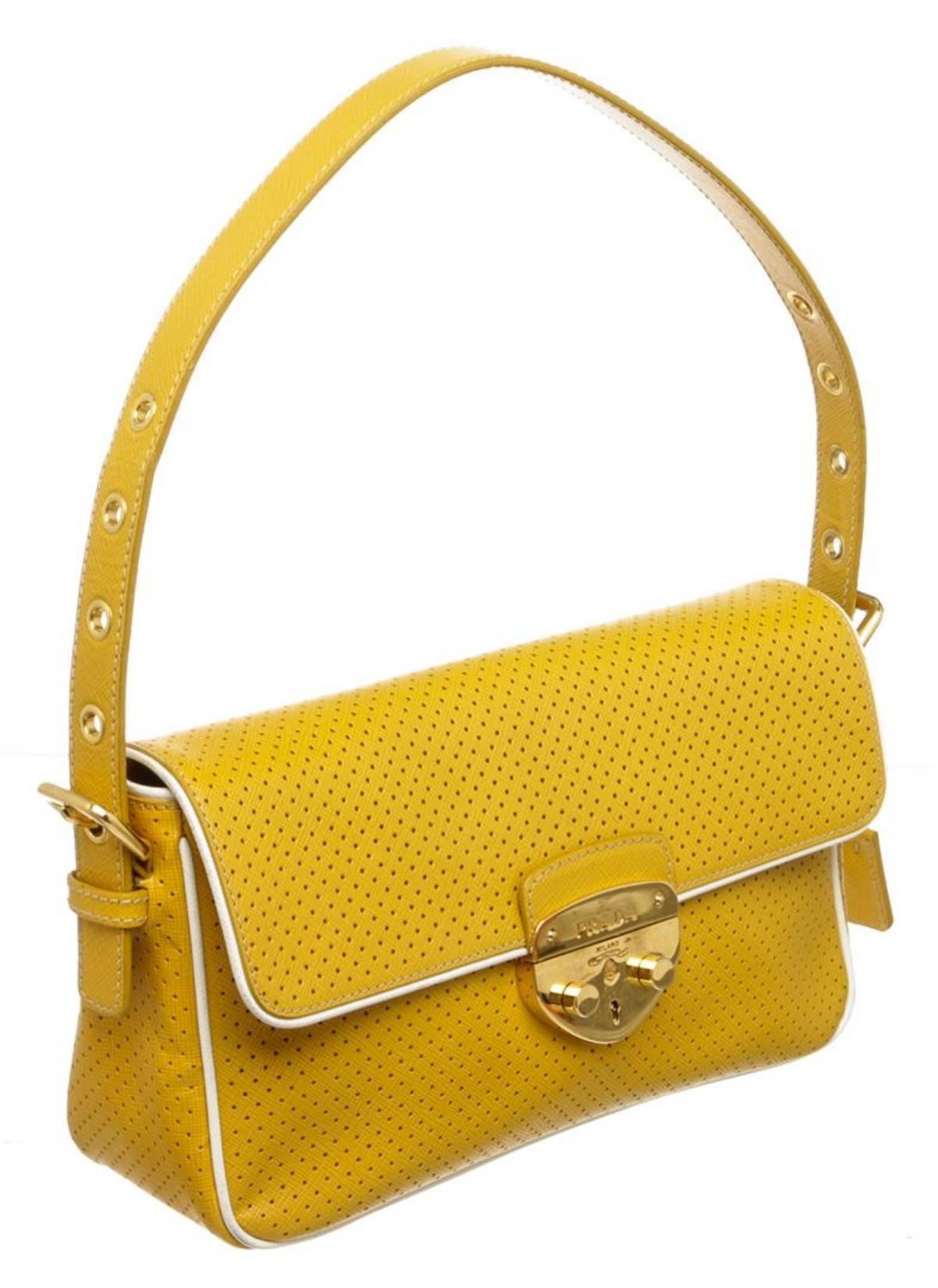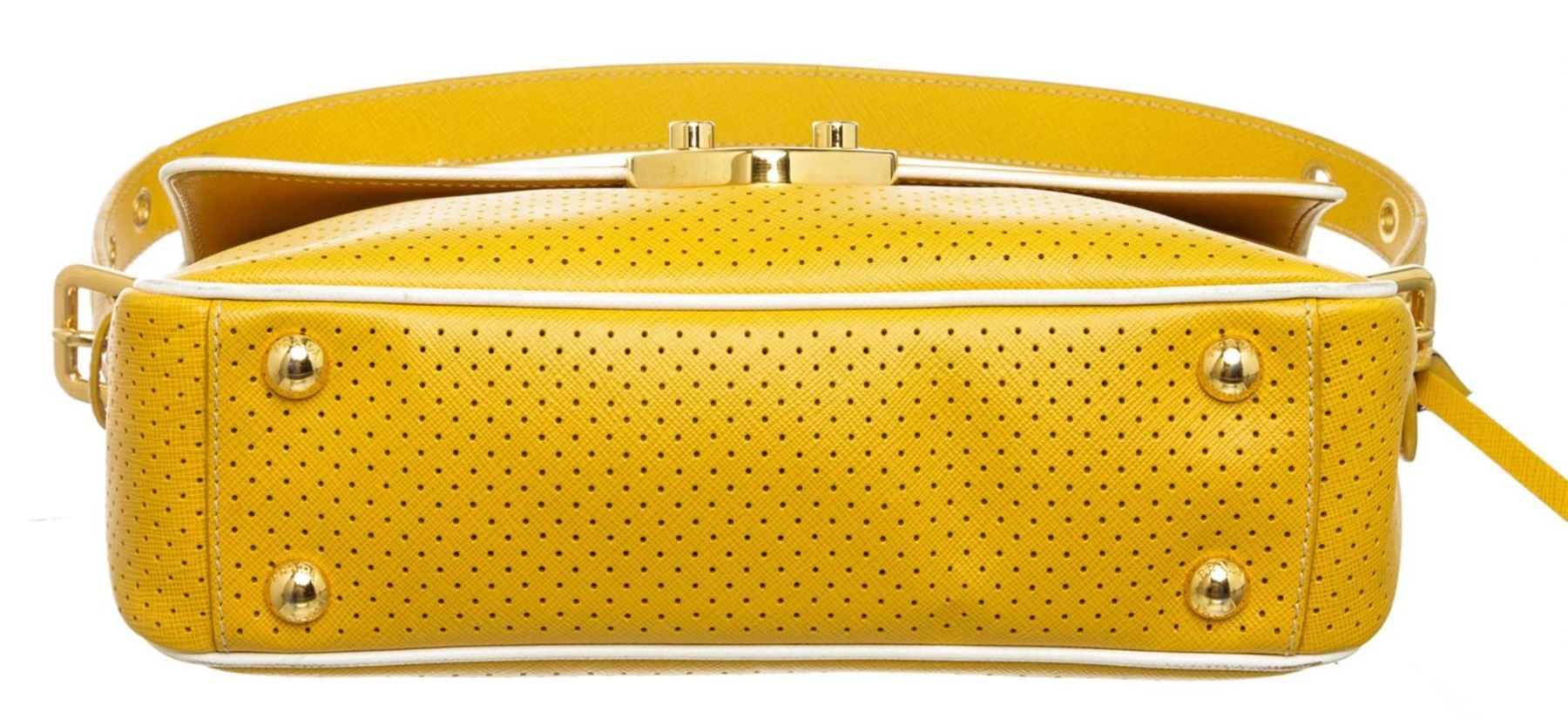 One Prada Yellow Perforated Leather Shoulder Bag. Prada yellow perforated leather shoulder bag with gold-tone hardware, yellow fabric lining, interior zip pocket, adjustable shoulder strap, flap with pinch-lock closure. MKX