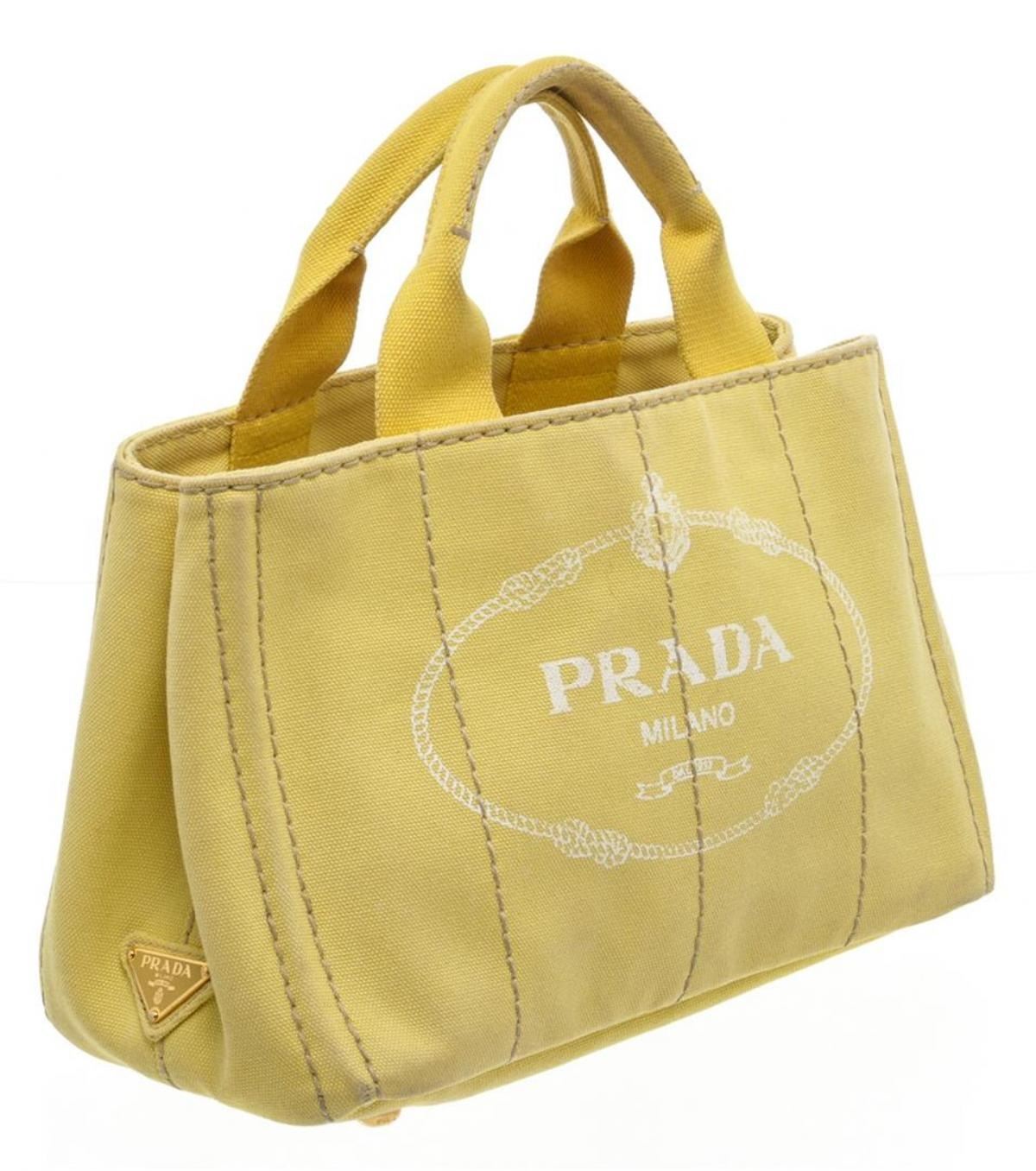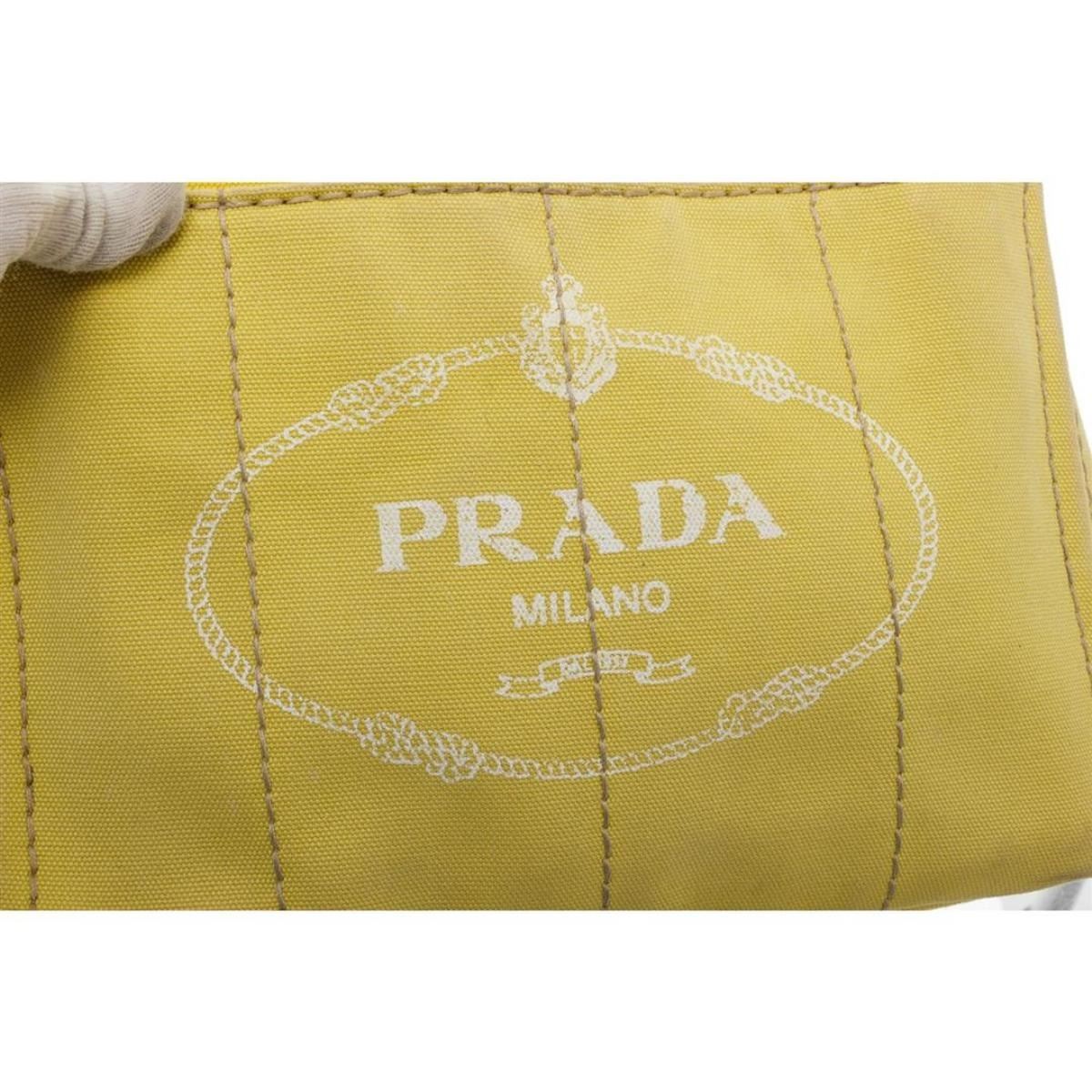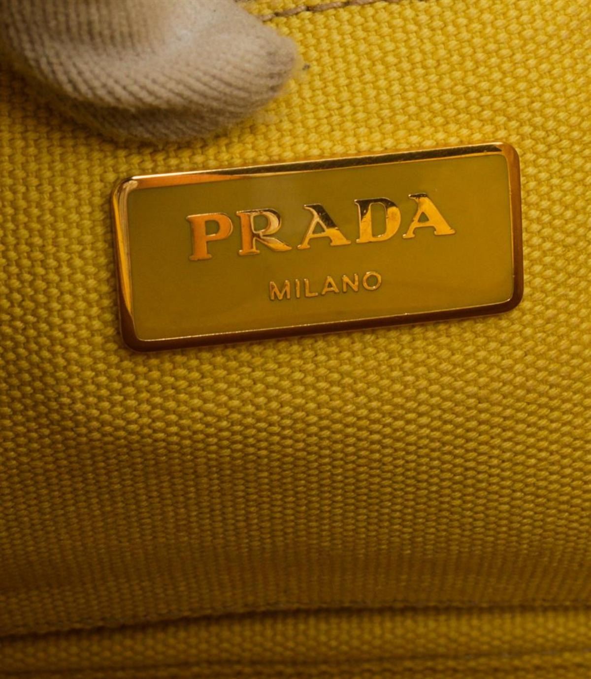 Prada yellow canvas Canapa tote bag with gold-tone hardware, dual interior slip pockets, interior zip pocket, side snaps, front logo print. Authentic.