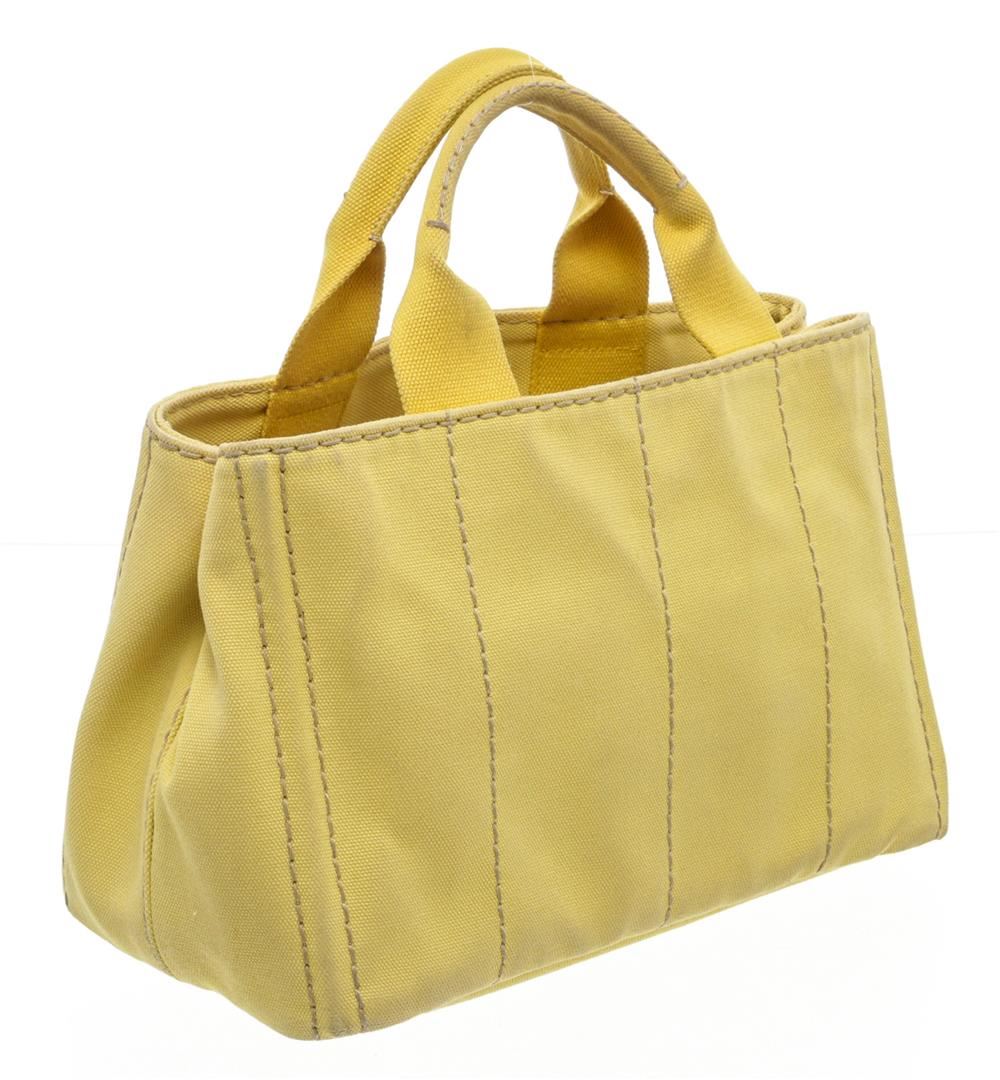 Prada yellow canvas Canapa tote bag with gold-tone hardware, dual interior slip pockets, interior zip pocket, side snaps, front logo print. Authentic.