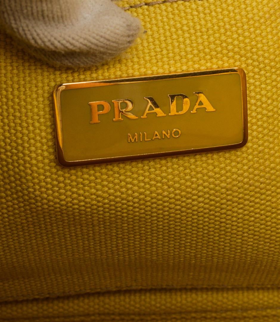 Prada yellow canvas Canapa tote bag with gold-tone hardware, dual interior slip pockets, interior zip pocket, side snaps, front logo print. Authentic.