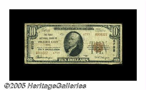 <B>Prairie City, IA</B></I> - $10 1929 Ty. 2 <B>The First NB</B></I> Ch. # 6755<BR>This very scarce one bank locale in Jasper County released only 519 Type 2 $10 notes. This problem-free <B>Fine</B></I> should sell in the range of. . .