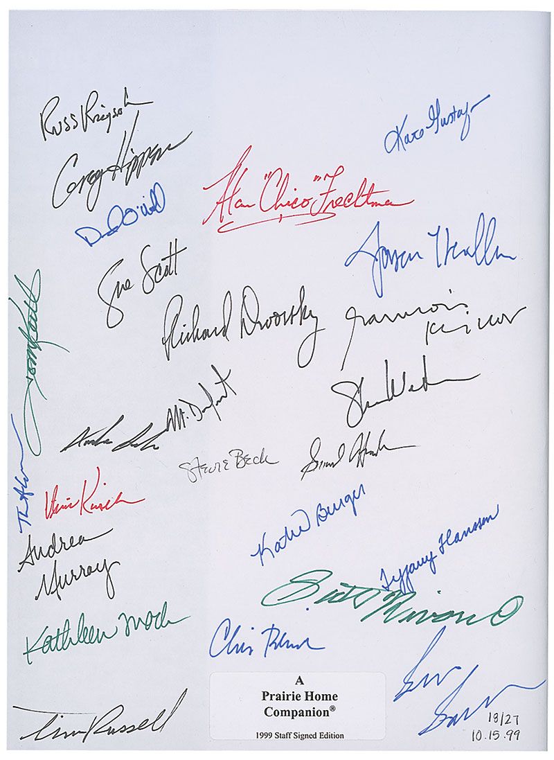 Signed book: A Prairie Home Commonplace Book. Special staff signed edition of 27 copies (this being No. 18). Minnesota: HighBridge Company, 1999. Hardcover with dust jacket, 9 x 11.25, 156 pages. Signed on the reverse of the first free end page by Garrison Keillor as well as the rest of the Prairie Home Companion staff. In fine condition.
