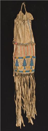 Prairie? Pipe Bag. 28" long with fringe. Beadwork is geometric with some pony beads. Decorated with ribbon panels. 19th century. Fine condition. Rare designs. (est $3,500-4,500)