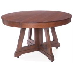 Prairie School dining table, manufactured by Grand Rapids Furniture Co., circular top over a flared cutout base on a shoefoot, refinished, four leaves, 50”dia. x 30”h, very good condition