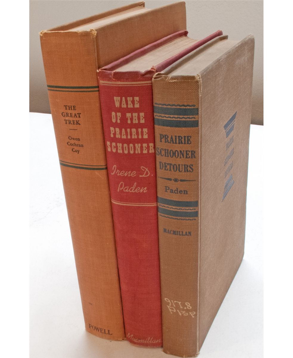 Lot of three includes: 1) Wake of the Prairie Schooner by Paden, Irene. Hardcover, indexed, 514 pages, Paher # 1501.The Macmillan Company, New York, 1943; 2) Prairie Schooner Detours by Paden, Irene. Hardcover, indexed, 293 pages, Paher # 1500.The Macmillan Company, New York, 1943; 3) The Great Trek by Coy, Owen Cochran. Hardcover, indexed, 349 pages. Powell Publishing Company, SF/LA/Chicago, 1931.City: County: State: