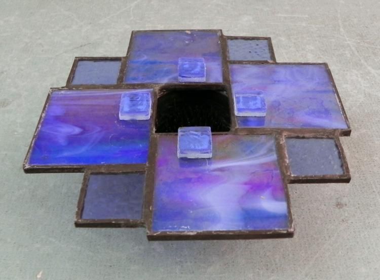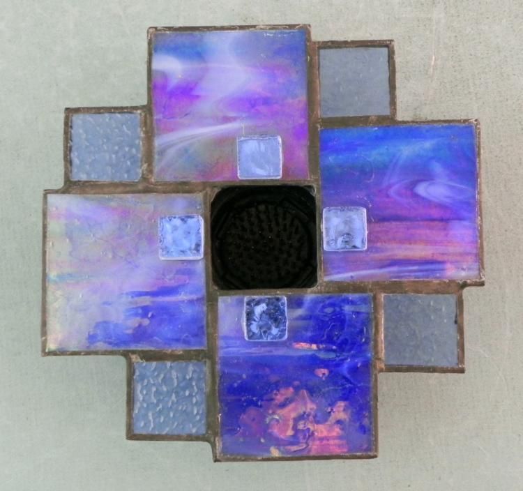This Stained Glass piece is in a Prairie Style, with squares of marbled blue and light blue pebbled glass, with iron settings and base. The pins inside allow it to be used as a flower vase or candle holder. The size is 5 1/5". It is in excellent condition. * This is a nice piece of glass craftsmanship.