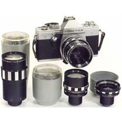 1) "Praktica TL 3", Deckkappe etwas beschädigt, (4/4). - Und: 2-5) Vierteiliger Enna-Objektivsatz und Enna-Sockel M 42: Ultra-Lithagon 3,5/28, Ennalyt 1,9/50, Tele-Ennalyt 3,5/135 und Tele-Ennalyt 4,5/240. Der Sockel und das 1,9/50-mm-Objektiv mit Gebrauchsspuren (3-/3), die anderen Objektive sehr gut (2/2). Praktica TL 3 with rare Enna convertible objectives (4 lenses and Enna base). - € 150/200 - (939/6)