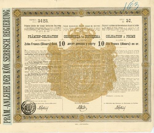 1888, Belgrad. Stock certificate. Blue/Black/Gold. Large overprint in gold.