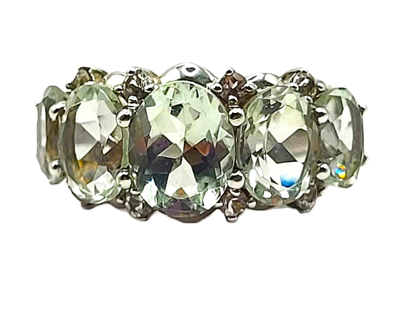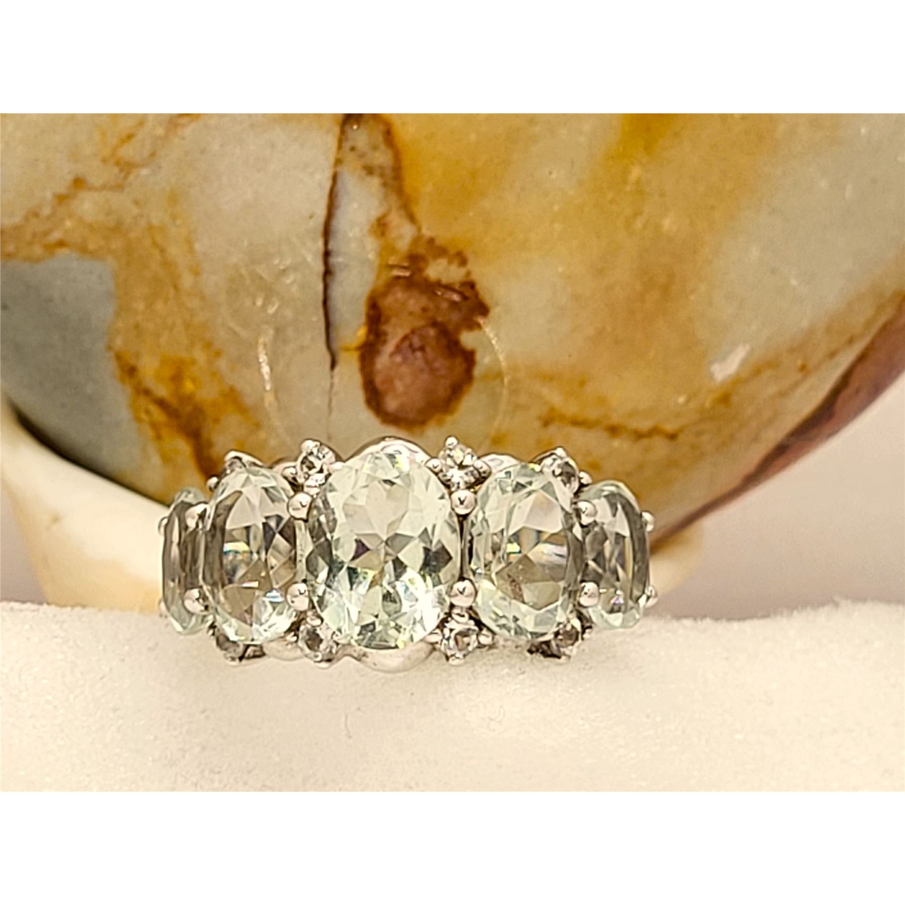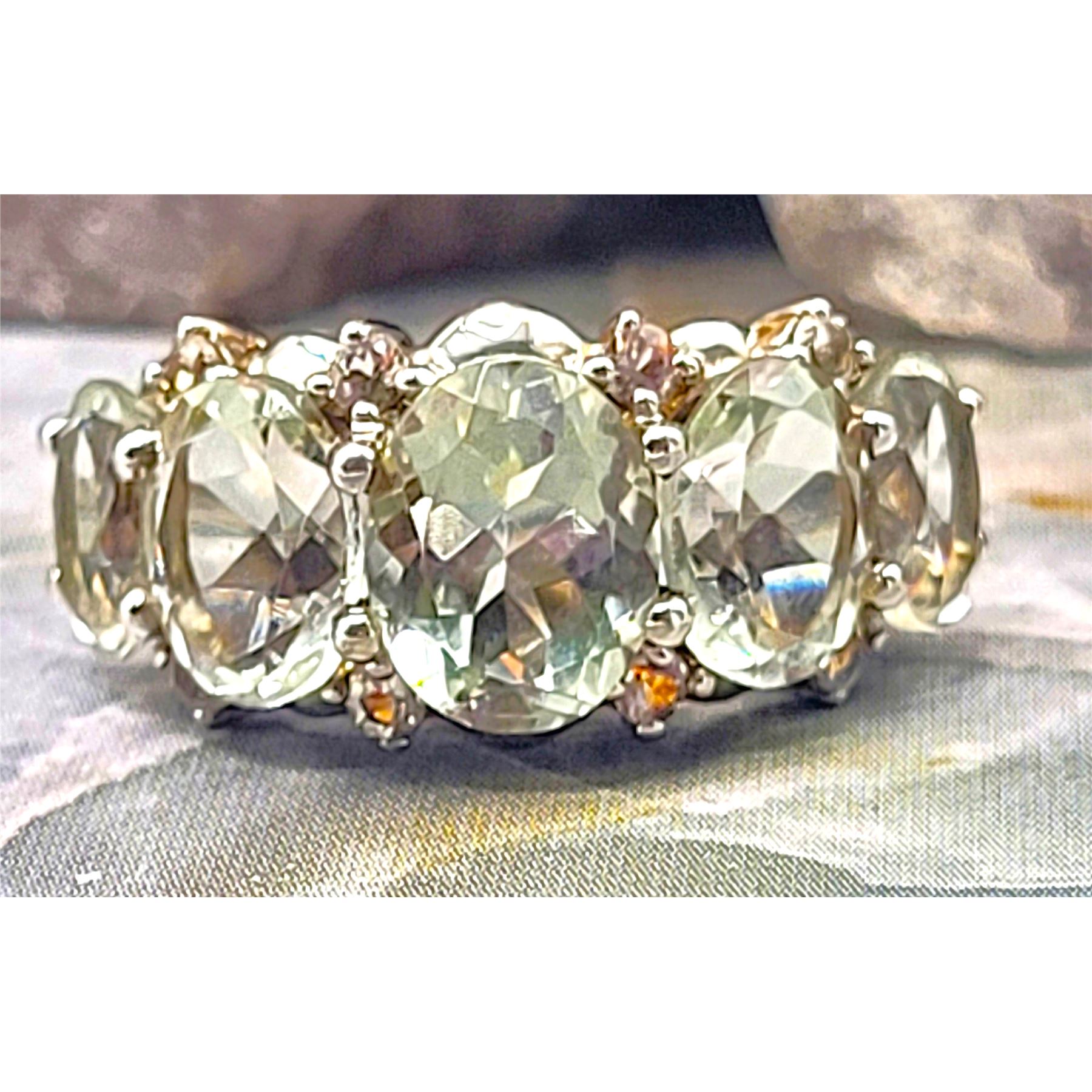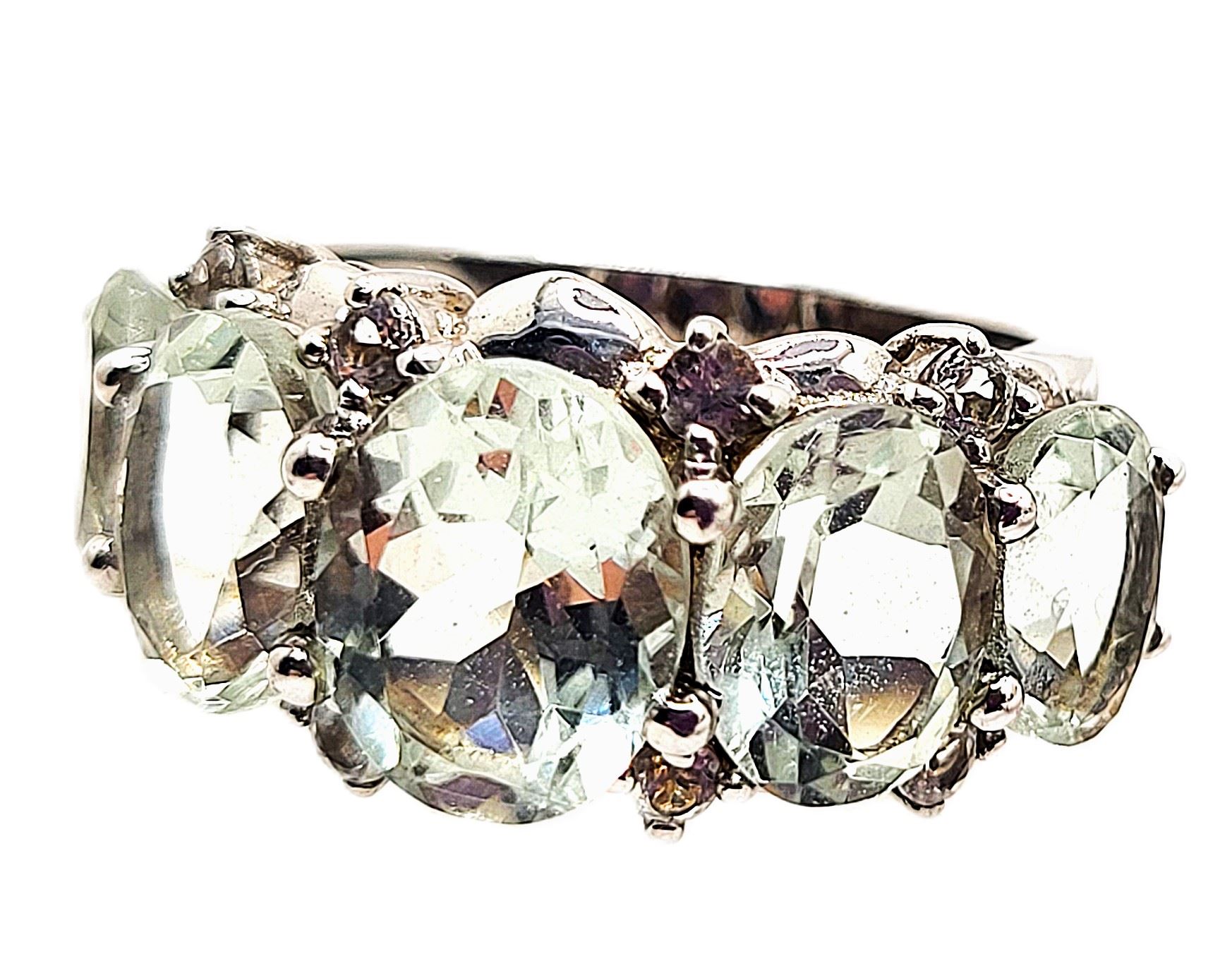This is a sterling silver ring which features approximately 6.00 carats total weight of oval-cut, & nbsp; prong-set, genuine green amethysts, also called prasiolite, green quartz, and vermarine.Scattered between the larger, oval-cut gemstones are smaller, round, faceted, quartz stones (amethyst, citrine, smoky quartz, etc).& nbsp; The five-stone ring symbolizes significant achievements of one's lifetime. This ring is US size 4.5 . See sizing details and other information below.& nbsp; Admin:K47336/hhh
