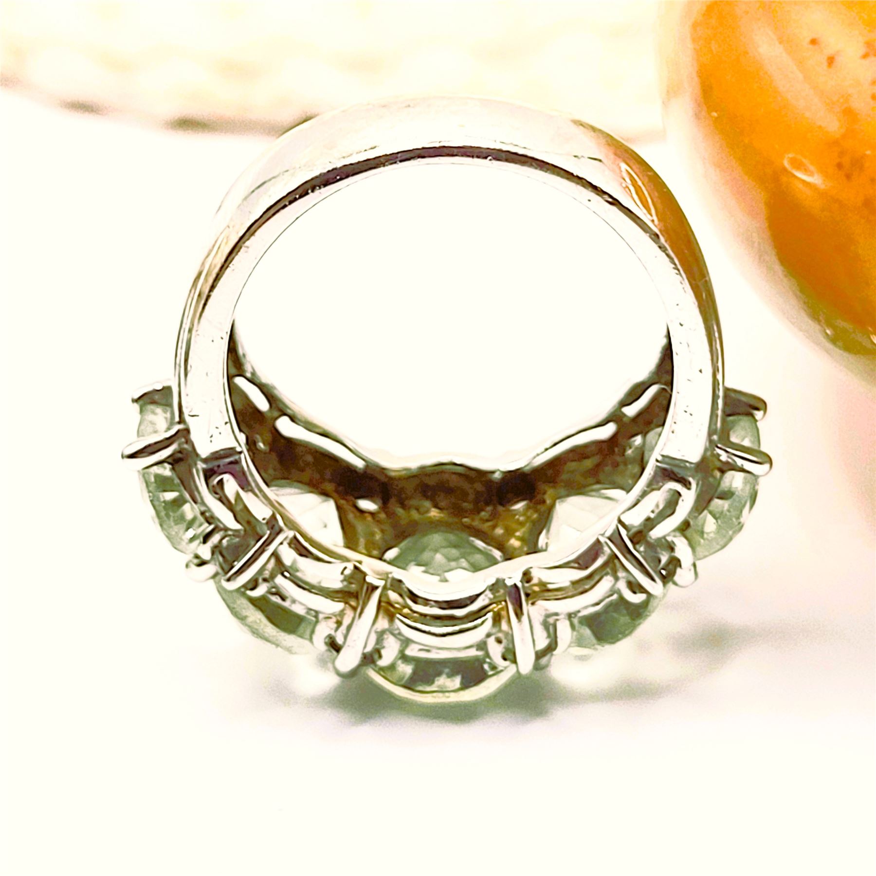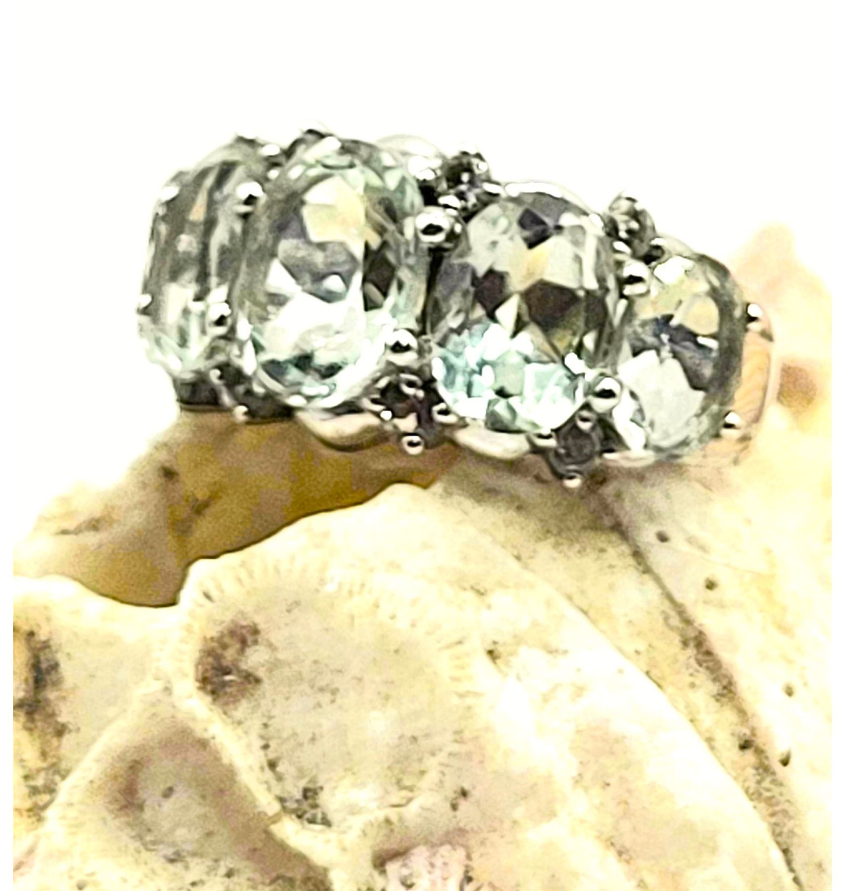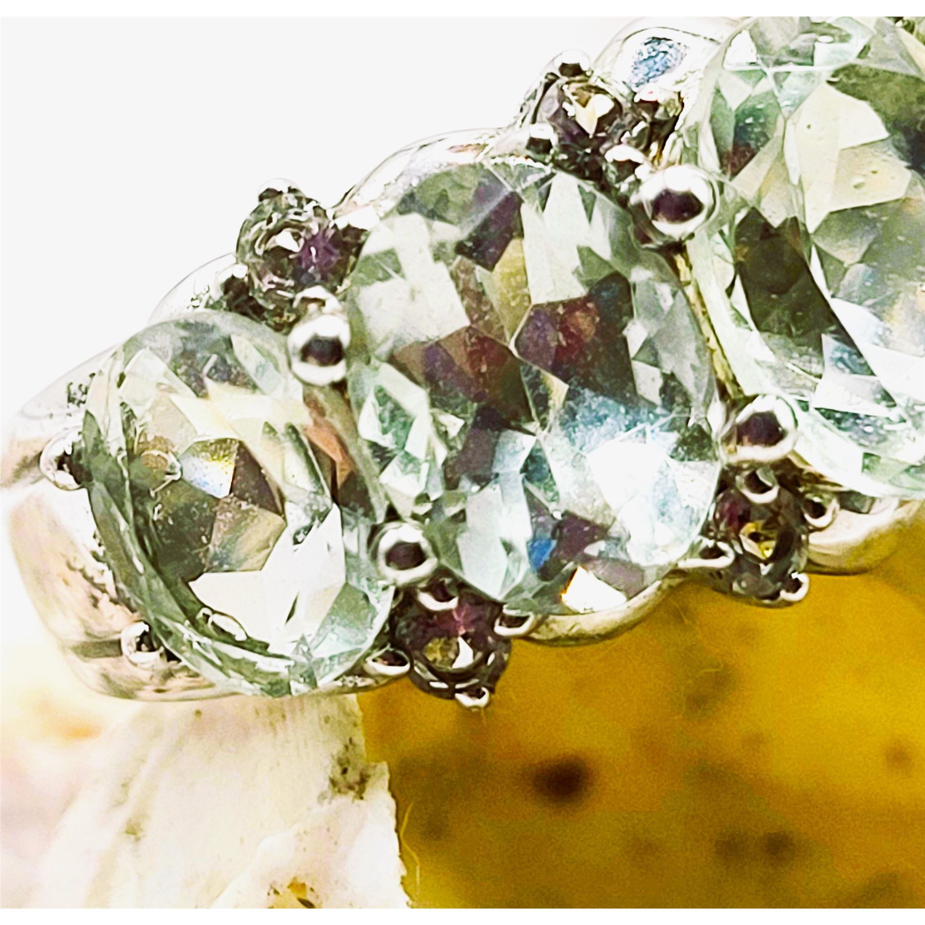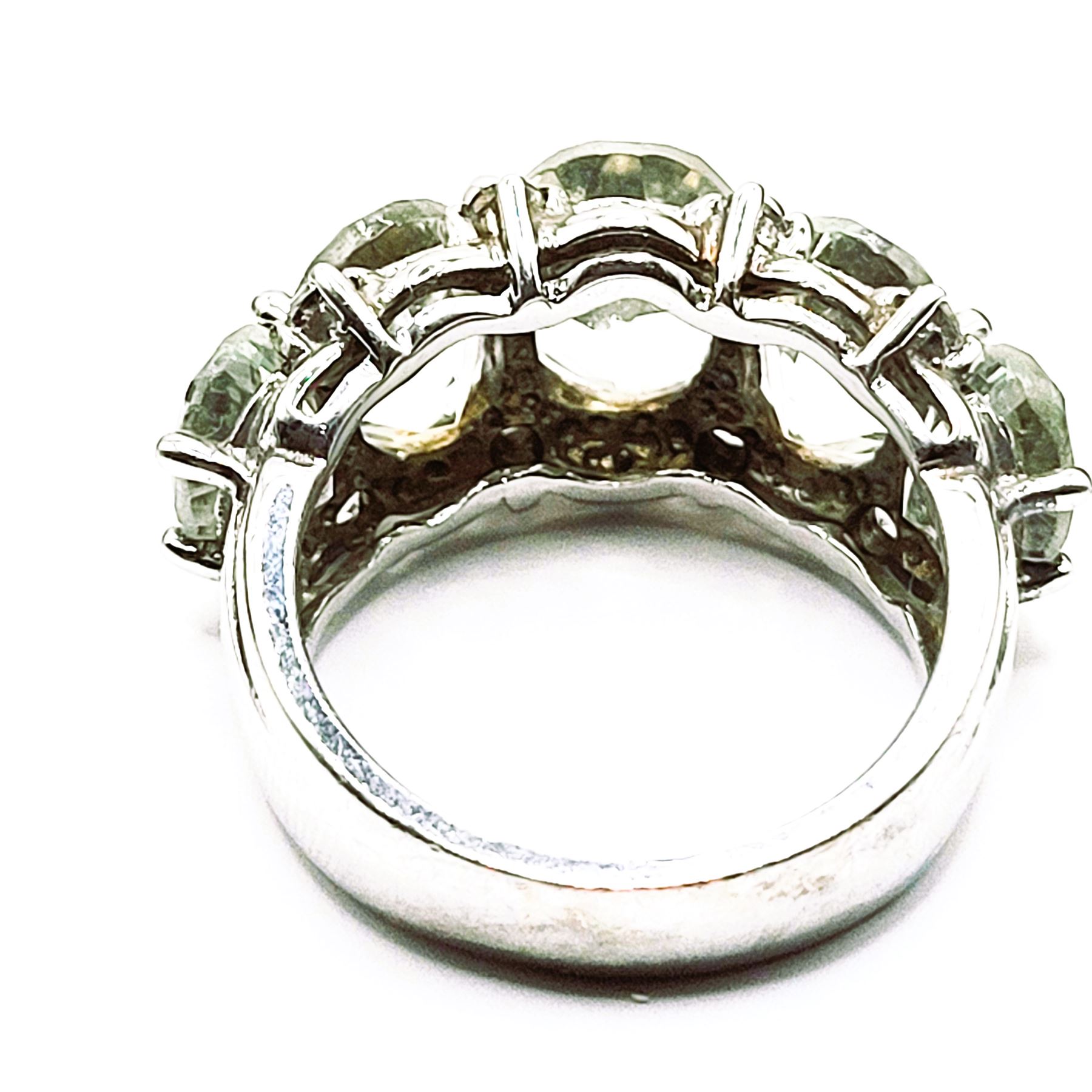 This is a sterling silver ring which features approximately 6.00 carats total weight of oval-cut, & nbsp; prong-set, genuine green amethysts, also called prasiolite, green quartz, and vermarine.Scattered between the larger, oval-cut gemstones are smaller, round, faceted, quartz stones (amethyst, citrine, smoky quartz, etc).& nbsp; The five-stone ring symbolizes significant achievements of one's lifetime. This ring is US size 4.5 . See sizing details and other information below.& nbsp; Admin:K47336/hhh