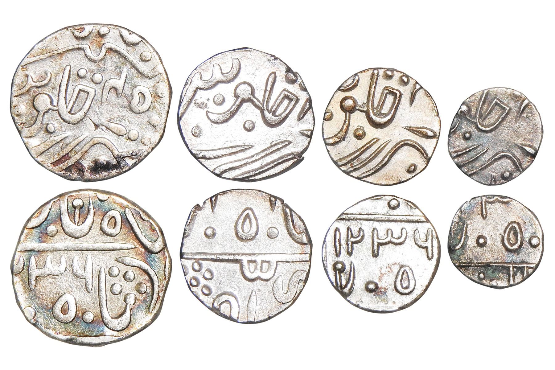 Pratapgarh - a set of four Silver coins of Duleep Singh (1825-1864 AD), 1, 1/2, 1/4 and 1/8th rupee of the 'new Saleem shahi' series, in the name of Shah Alam II, with AH1236 / RY45 (both frozen); KM 23, 22, 21, 20 and weight: 10.80 grams, 5.20 grams, 2.60 grams and 1.30 grams respectively. VF+, Scarce.