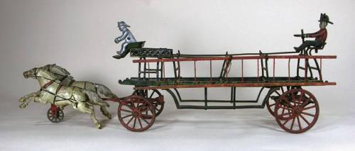Pratlinchraff (?) cast iron toy horse drawn hook and ladder, 24 inches long, Good Cond.