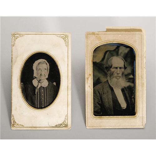<B>Thomas Pratt, Tintypes. Two Original Tintype Photographic Portraits</B></I> (4 x 2.5 inches each), ca. 1870, of Captain Thomas Pratt and his wife Susan Vince Pratt. Both images are sharp and clear, in very nice condition, and enclosed in original paper mats with printed decorative borders.<BR><BR>One of Stephen F. Austin's "Old Three Hundred" colonists, Susan Vince Pratt (1798-1878) came to Texas from Georgia in 1822 with four brothers: Allen, William, Robert, and Richard. In 1824 Austin's Colony officially granted them a league of land situated on Vince's Bayou in Harris County. Family legend holds that the Vinces brought the first domestic hogs as livestock from the Old South to Texas. In April 1836 Sam Houston's army and Santa Anna's army crossed the bayou at Vince's Bridge, which Houston then ordered destroyed prior to the battle of San Jacinto.<BR><BR>Susan Vince later married Thomas Pratt (1807-1878), who came to Texas from South Carolina during the Texas Revolution. Promoted to Captain, Thomas Pratt commanded the First Company of Thomas Jefferson Green's First Regiment, Second Brigade of the Army of the Republic of Texas. Some historical accounts maintain that Pratt participated in the Mier Expedition, but his name does not appear on any official rosters. In 1860 Thomas Pratt and Susan Vince Pratt moved to Lampasas County, where they engaged in farming and ranching. They soon purchased acreage in Coleman County as well. During the Civil War Capt. Pratt served in the Texas Confederate militia. The 1870 U.S. Census listed Thomas Pratt, age 61, as a prosperous "farmer," and Susan Vince Pratt, age 73, as "keeping house." The Pratts are buried in Oakwood Cemetery in Lampasas. <I>Courtesy of Denwood and Dana Butler, Mason.</B></I> Consigned Lot <BR><BR><b>This 2006 March Texas State Historical Association Charity Auction is being held in Austin, TX on February 12 - March 4, 2006. This is a charity auction. All proceeds from donated lots in the auction, commissions from consigned lots, and the buyer's premium go solely to the Texas State Historical Association. The floor auction session is by invitation only. Online bidding ends March 3, 2006 at 10:00PM CT. Your secret maximum bid will compete for you during the floor auction, and it is possible that you may be outbid on the floor after internet bidding closes. The applicable buyer's premium for this auction is an amount equal to 15% (minimum $9 per lot) of the successful bid on ebay. State law requires lots consigned (not donated) to THSA collect full sales tax on items that sell for a total of $5,000 or more. </b>