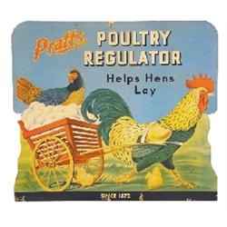 Pratts Poultry Regulator die cut cdbd. easel back sign, nail holes in bottom & thumb nail sized missing pc. at top, otherwise VG condition & great colors, 20"W x 18"H.