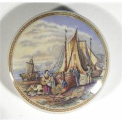Prattware pot lid 'Pegwell Bay Examining The Nets', 11cm diameter