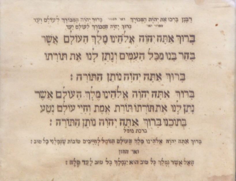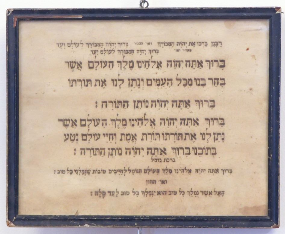 Prayers of the Torah [Hebrew] - old handwritten sign, yellowing paper, some foxing, framed, dimensions: 28x22 cm.