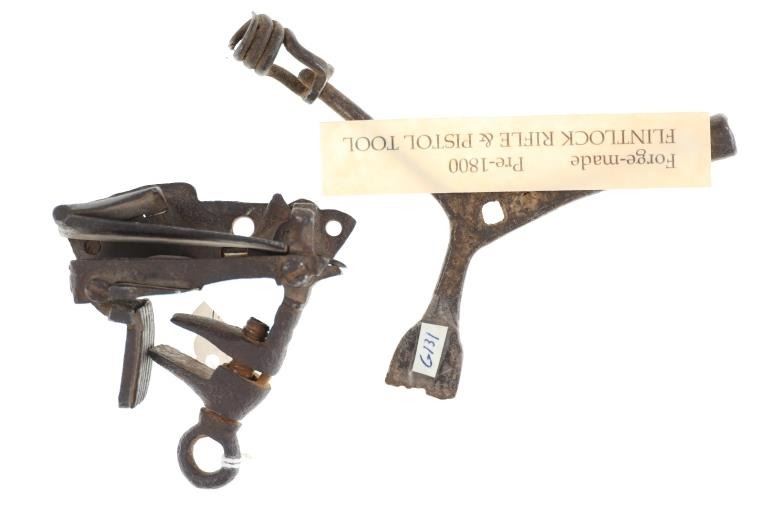 Featured in this lot is this unmarked pre-1800's flintlock mechanism and tool; Provenance: From the Tombstone Western Heritage Museum in Tombstone, Arizona. There is a 18th century flintlock mechanism and a pistol maintenance tool in this collection. Both were housed in the Tombstone Western Heritage Museum. The mechanism is unmarked indicating forge construction with the moving parts working as intended. The pistol tool is a three prong leverage tool with a flat blade, a socket, and a leverage socket. The collection comes complete with a original museum tag that reads as follows: Forge-made - Pre-1800 - Flintlock rifle and Pistol Tool. The condition of this flintlock mechanism and pistol tool is preserved with some oxidation adorning the mechanism and the tool but otherwise shows a preserved condition. The measurements of this flintlock mechanism is 3 1/2" x 3 1/4" x 1 1/8" and the pistol tool measures 4 3/4" x 4 3/4" x 5/8". G131, G39