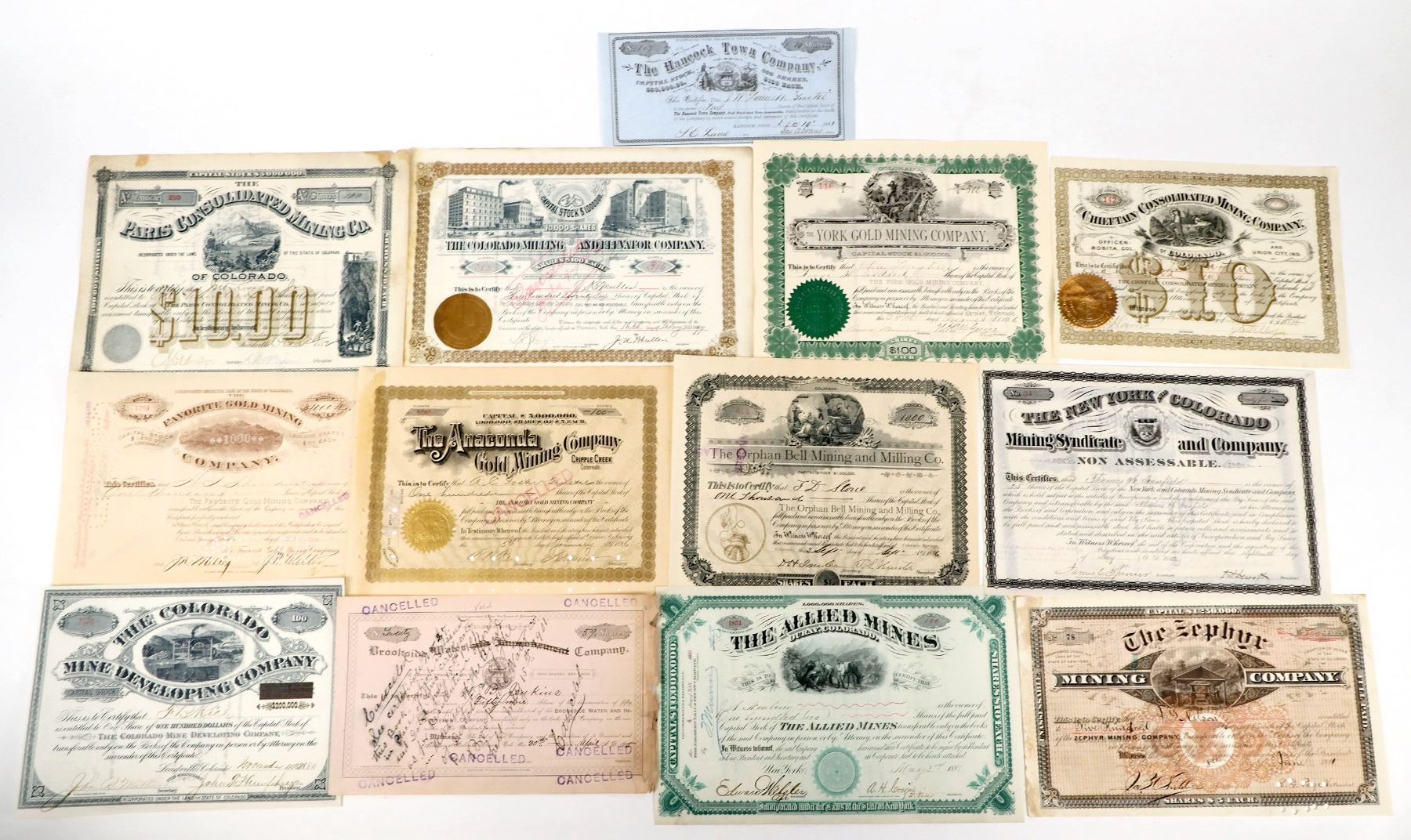 Lot of 15 different. Excellent collection! Includes: Colorado Mine Developing Co. (1880); Brookside Water Company (1895); Paris Consolidated MC (1882, Leadville); Chieftain Cons. MC (1884, Leadville); Allied Mines (1881, Ouray); Hancock Town Co. (1881); Zephyr MC (1881, Leadville); Farwell Cons. MC (1881); New York & Colorado Mining Syndicate & Co. (1882); London Mining Co. bond (1882): Orphan Bell M&MC (1896); Anaconda GMC (1896 signed by Moffat); Favorite GMC (1899); Colorado Milling & Elevator Co. (1899); and York GMC (1896).