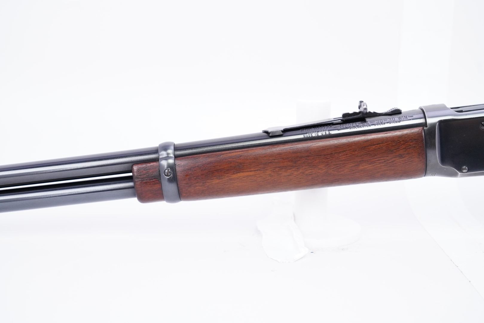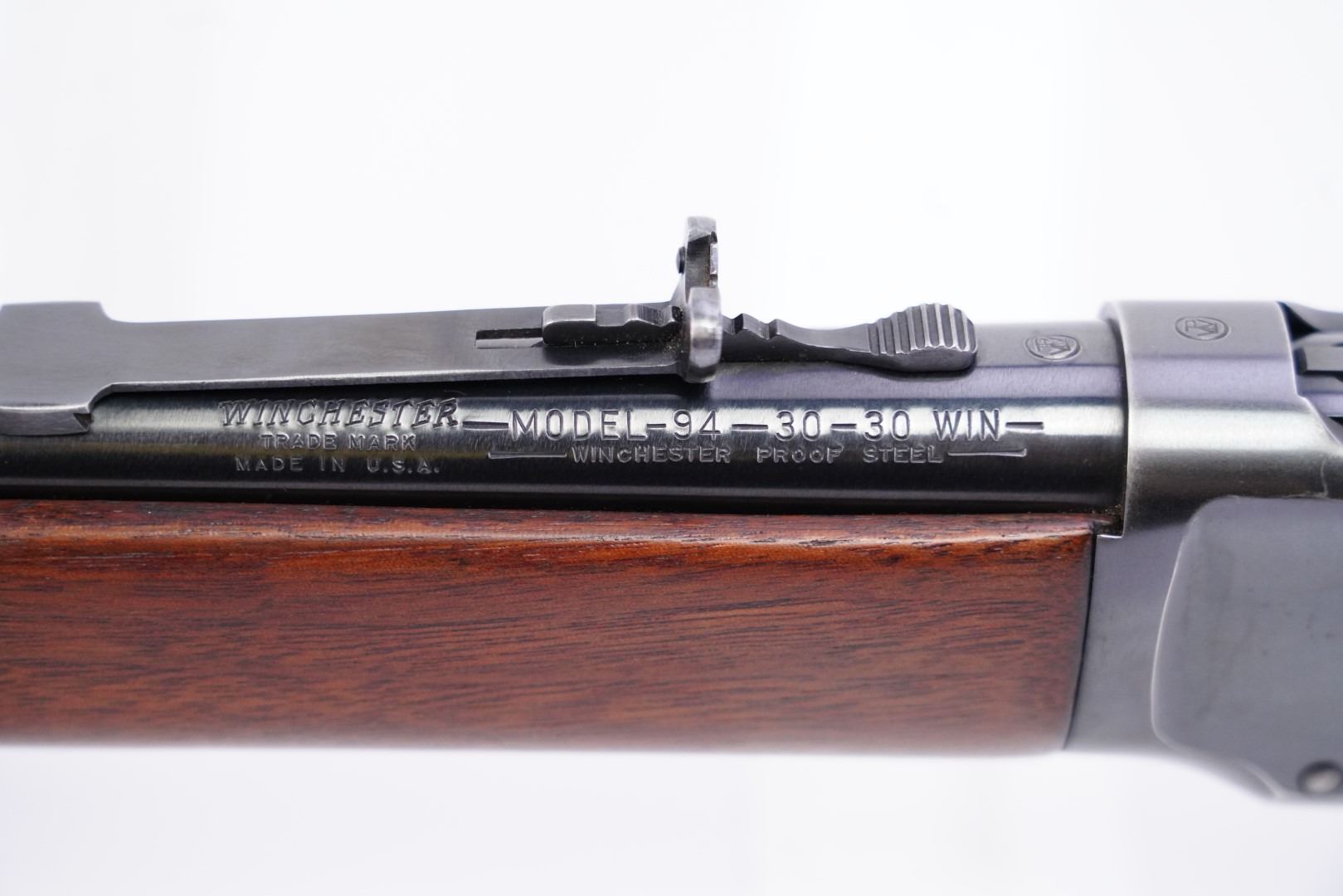 Markings: The left side of the barrel at the rear is marked "WINCHeSTeR / TRADe MARK / MADe IN U.S.A." and "—MODeL - 94 – 30 -30 WIN— / —WINCHeSTeR PROOF STeeL—". The top of the chamber ring and shank is marked with a Winchester proof mark. The bottom of the receiver is marked with the serial number at the front. The lower tang is marked "J" in front of the trigger.