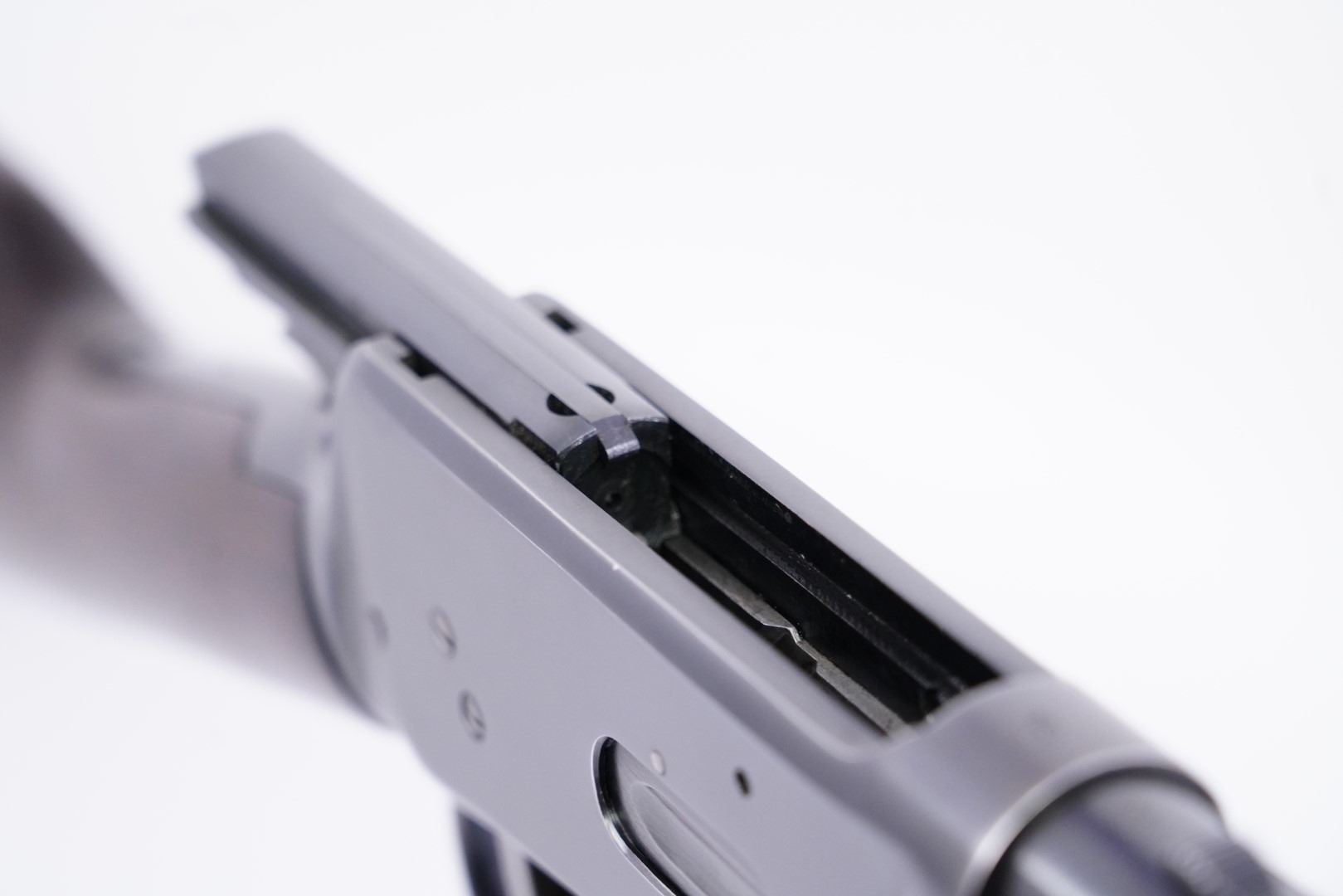 Sights / Optics: The front sight is a hooded beaded blade dovetailed atop a textured ramped riser that is fixed to the barrel. The rear sight is a U-notched elevator sight dovetailed to the receiver.