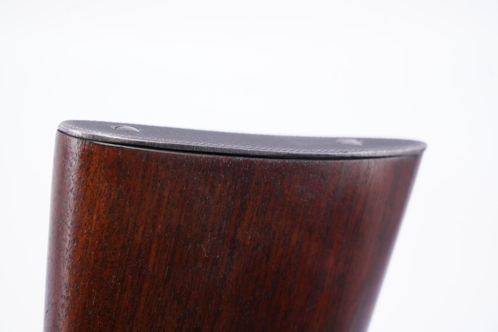 Stock Configuration & Condition: The stocks are two-piece smooth wood with a banded forearm, straight grip, straight comb, and a checkered steel buttplate. There is a faint split just left of the toe. There is a notable scratch just left of the forearm at the front. Otherwise, there are just a few faint lines throughout the wood. There are no chips. The LOP measures 13 1/8" from the front of the trigger to the back of the checkered buttplate. The stocks rate in about Fine-Plus overall condition.