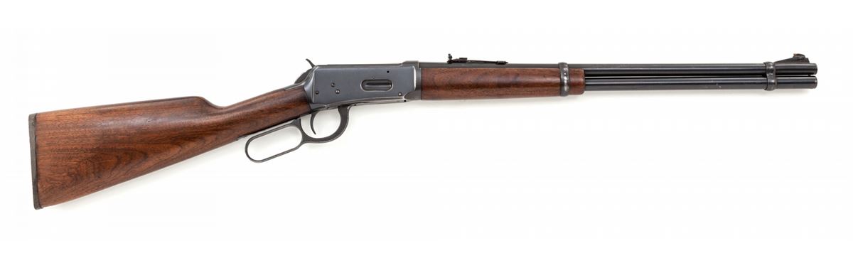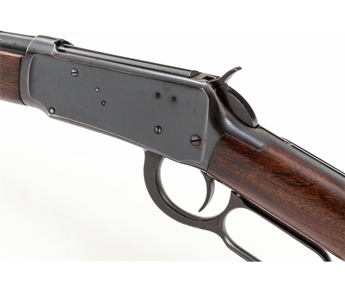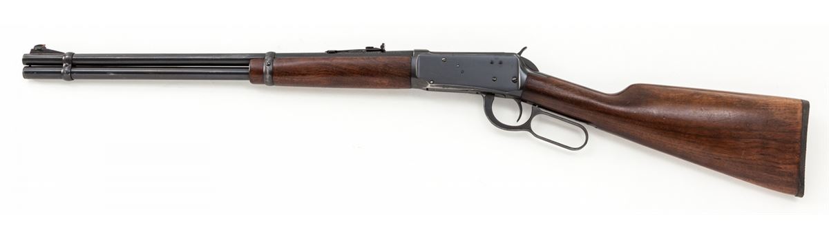 Pre-64 Winchester Model 1894 Lever Action Carbine, #1937085, .32 Win. Spec. cal., 20'' barrel, blue finish, smooth walnut stock, with replacement non-factory black checkered buttplate. Mfg'd 1953. Condition is about fine retaining approx. 96%+ factory blue with thinning to barrel bands and scratches to flat sides of frame. Stock with minor scuffs and scratches. Buttplate should be replaced with factory example. Action is crisp, bore is bright. Est.: $450-$600. (C&R)