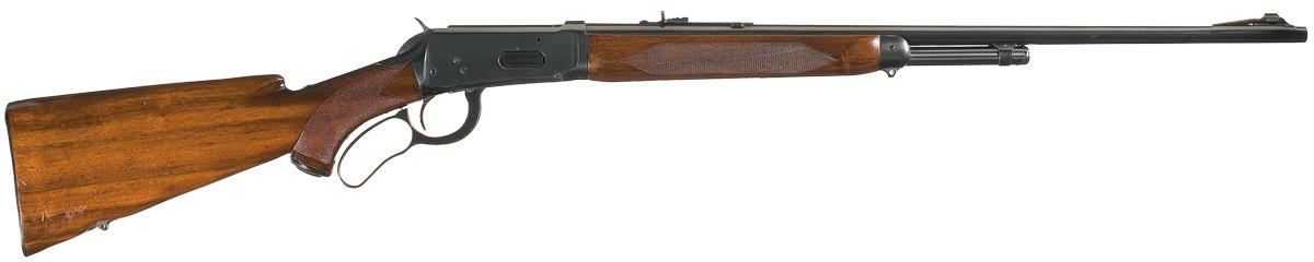 Early post-war production (pre-1948) Winchester Model 64 Rifle. Ramped blade front and adjustable buckhorn rear sights, standard barrel markings with the Winchester oval proof on top of the barrel and receiver at the breech, all blue finish and mounted with a checkered semi-beavertail forearm and pistol grip stock with a hard rubber Winchester grip cap, checkered steel buttplate and sling swivel bases.