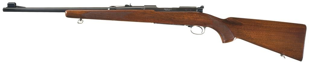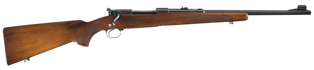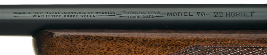 Manufactured in 1946 during the transition period (late 1945 to 1951). It is chambered in the desirable 22 Hornet caliber. Hooded ramp front sight and elevation adjustable rear sight on a 1945 stamped barrel marked with the Winchester legend on the left side. The receiver is tapped for scope/sight mounting with cloverleaf tang. Pre-war safety, polished bolt numbered to gun and sling swivels. The pistol grip stock features checkering and a checkered steel buttplate. All pre-War characteristics