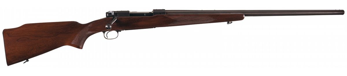 Manufactured in 1959 (receiver) and is in a varmint style configuration. Fitted with a heavy barrel tapped for scope/sight mounting, which is marked with the Winchester legend on the left side. The receiver is tapped for scope/sight mounting. The Winchester factory oval proof on the barrel and receiver. Straight receiver tang, late safety and polished bolt numbered to gun. Mounted on a varmint style, high comb checkered pistol grip stock without provisions for a forearm screw. The stock is fitted with a checkered steel buttplate.
