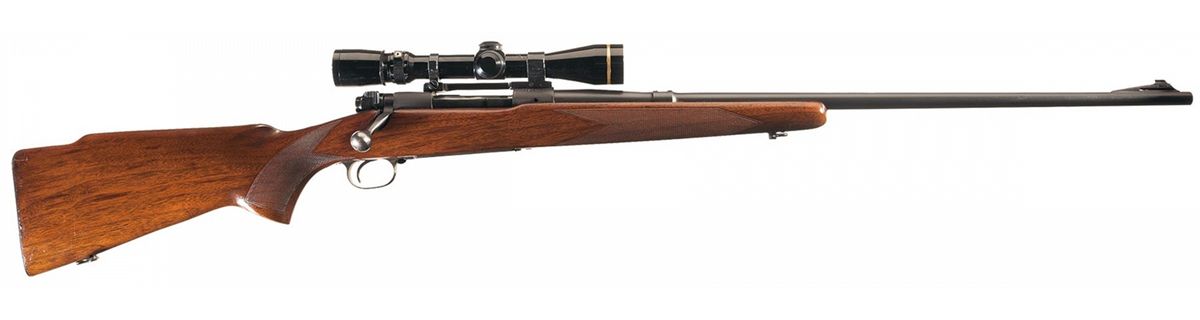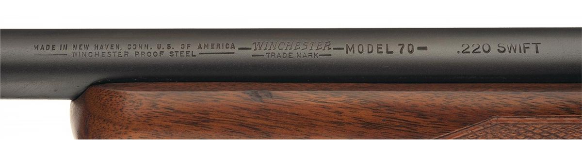 Manufactured in 1949 during the Transition period (late 1945 to 1951) in 220 Swift (approximately 20,000 were produced in this caliber). Late safety, straight tang, polished bolt numbered to gun, solid bolt handle and sling swivels. Standard Winchester markings including the factory proof on the left side of the barrel and receiver at the breech. Ramp front sight with provisions for a hood, empty rear dovetail sight slot and Leupold 2.5-8x scope on Redfield mounts. Checkered high comb pistol grip stock with checkered steel buttplate.