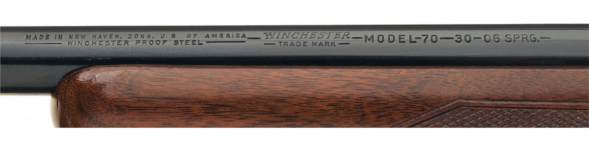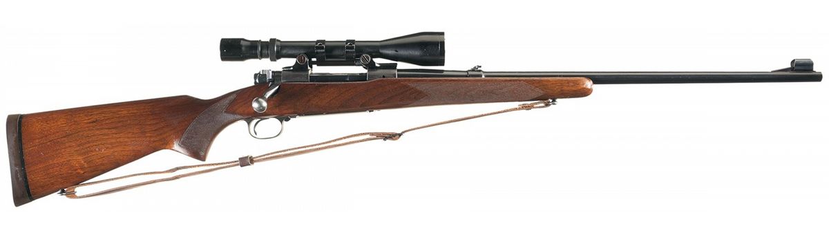 Manufactured in 1951. Hooded ramp front and adjustable leaf rear sights with a Balvar 8 scope. Standard Winchester markings including the factory proof on the left side of the barrel and receiver at the breech, late safety, polished bolt numbered to gun and an added Uncle Mike's solid recoil pad. Checkered straight comb pistol grip stock with slings and leather sling.