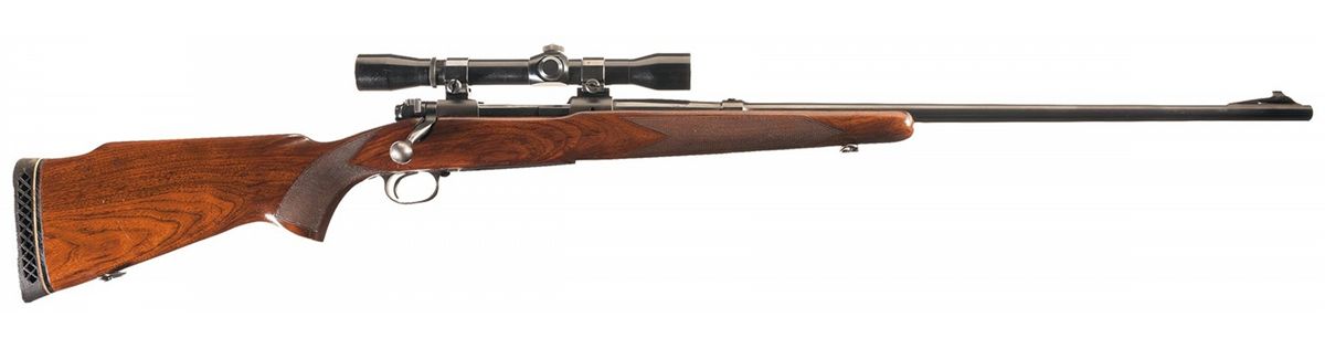 Originally manufactured in 1953 and later chambered for the 300 Weatherby Magnum cartridge. The left side of the barrel has the Winchester legend with "300 H&H MAGNUM" ahead of the rear sight slot which has a Williams filler block and "WEATHERBY/300 MAGNUM" marked at the breech. Factory proof on the left side of the barrel and receiver at the breech, polished bolt numbered to gun and Lyman 4x scope on Weaver mounts. Checkered high comb pistol grip stock with sling swivels and Fray-Line Deluxe vented recoil pad.