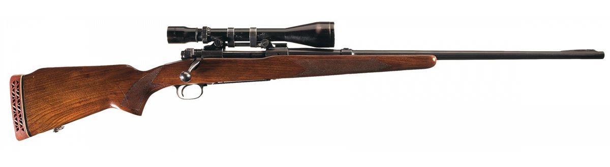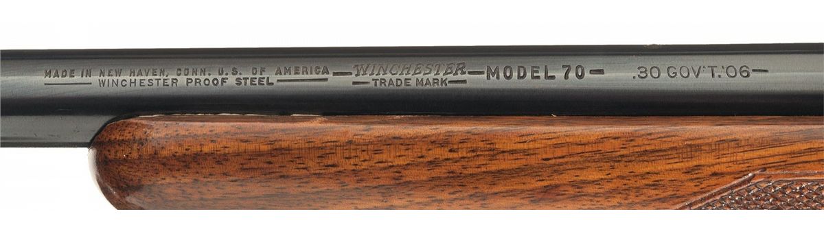 Manufactured in 1949 during the Transition period (1945 to 1951). Ramp front sight base (not machined to accept a hood) with filler block, tapped for sight mounting ahead of the filler block in the rear sight slot and Bausch & Lomb Balvar 8 scope on a Bausch & Lomb mount. Standard Winchester markings including the factory proof on the left side of the barrel and receiver at the breech. Straight receiver tang, late safety and polished bolt numbered to gun. Checkered high comb pistol grip stock with buttstock sling swivel and added vented White Line Deluxe recoil pad. Consignor notes refer to the rifle as a custom national match.