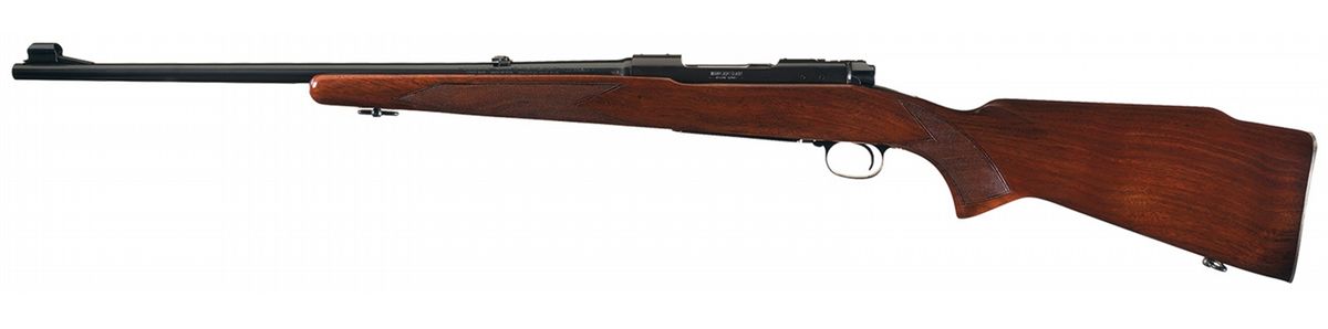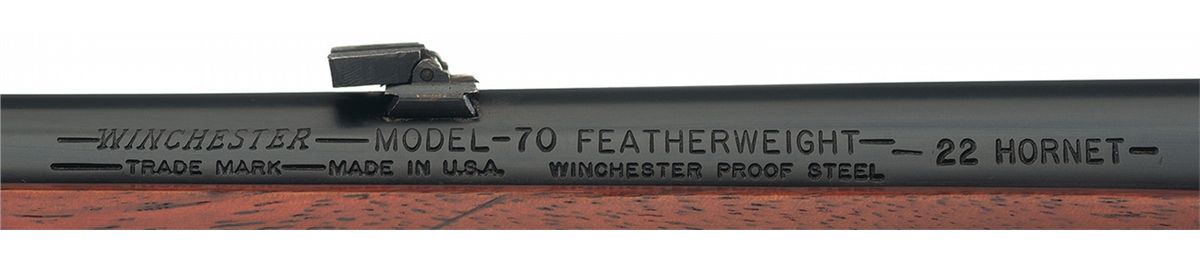 Manufactured in 1952 (receiver). It is chambered in 22 Hornet. Model 70 expert and author Dean Whitaker has stated that production status of standard Model 70 Featherweight rifles in .22 hornet is "unknown" but "possibly produced in very small numbers on a special-order or experimental basis." Hooded ramp front sight and adjustable folding leaf rear sight on a barrel marked with the Winchester legend on the left side. The Winchester factory oval proof is stamped on the barrel and receiver. Receiver tapped for scope/sight mounting, straight receiver tang, polished bolt not numbered and sling swivels.