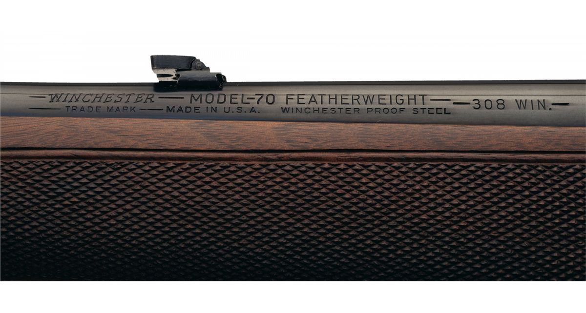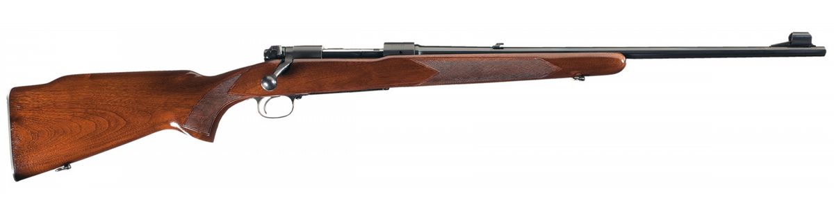 Manufactured in 1953, the second year of production for this model. Integral "type 5" hooded ramp front sight and a folding elevation adjustable rear sight. The top of each receiver bridge is drilled and tapped for scope mounting and the left rear side is drilled and tapped for a rear sight with all having filler screws. Receiver has the straight tang and the safety is the "Late" type. Mounted on a multi-point checkered walnut Monte Carlo stock with sling swivels and a checkered aluminum buttplate.