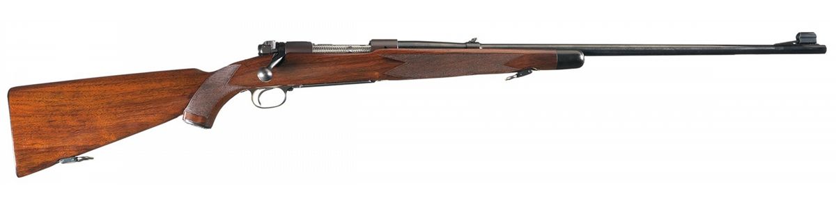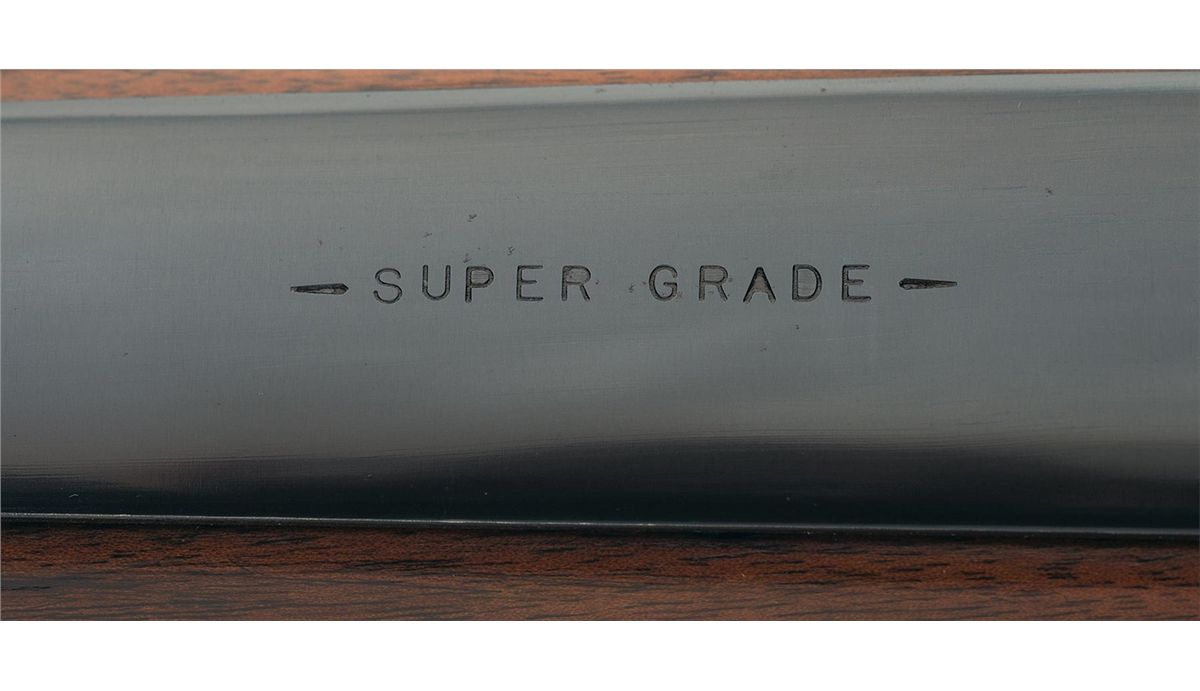 Manufactured in 1950. Hooded ramp front and folding leaf rear sights with the receiver tapped for scope/sight mounting. The barrel has the standard Winchester legend on the left side with the factory proof on the left side of the barrel and receiver at the breech and "-SUPER GRADE-" on the floor plate. Straight receiver tang, late type safety, jeweled bolt and follower with the bolt un-numbered and Super Grade quick release sling swivels. Checkered pistol grip stock with Winchester grip cap, ebony forend tip, cheekpiece and checkered steel buttplate.