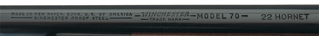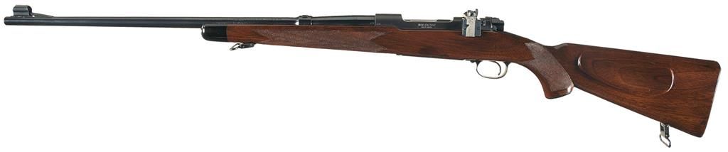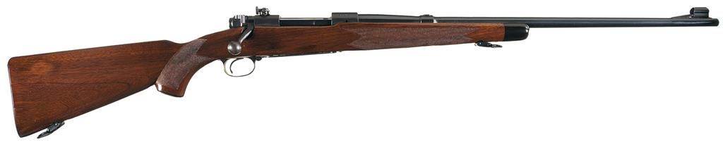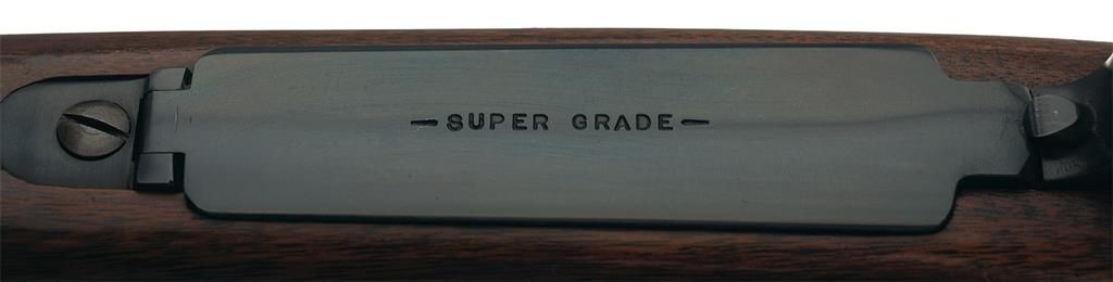 Manufactured in 1949 during the transition period (late 1945 to 1951). Hooded ramp front sight and a filler block in the rear sight dovetail slot with the Winchester legend marked on the left side of the barrel. The receiver is tapped for scope mounting and has a Lyman sight (stock not inletted). The floor plate is marked "-SUPER GRADE-". Late safety, straight receiver tang, quick release sling swivels, solid bolt knob and polished bolt numbered to gun. The nicely figured straight comb pistol grip stock features multi-point checkering, ebony forend tip, Winchester hard rubber grip cap, right handed cheekpiece and checkered steel buttplate.