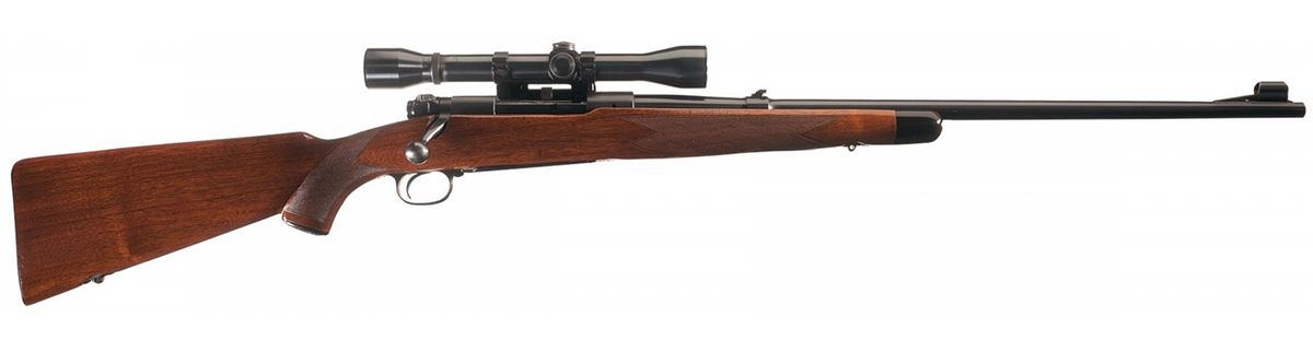 Manufactured in 1947 during the transition period (late 1945-51). The rifle has standard Winchester markings including the factory proof on the left side of the barrel and receiver at the breech and "-SUPER GRADE-" on the hinged floor plate. The polished bolt is numbered to the gun, transition safety, cloverleaf tang, hooded ramp front sight and adjustable folding leaf rear sight. Equipped with a Weaver K4 scope featuring a Pachmayr base mounted to the left side of the receiver. The Super Grade pistol grip stock features multi-point checkering, ebony forend tip, hard rubber factory grip cap, cheekpiece, sling swivel studs and checkered steel buttplate.