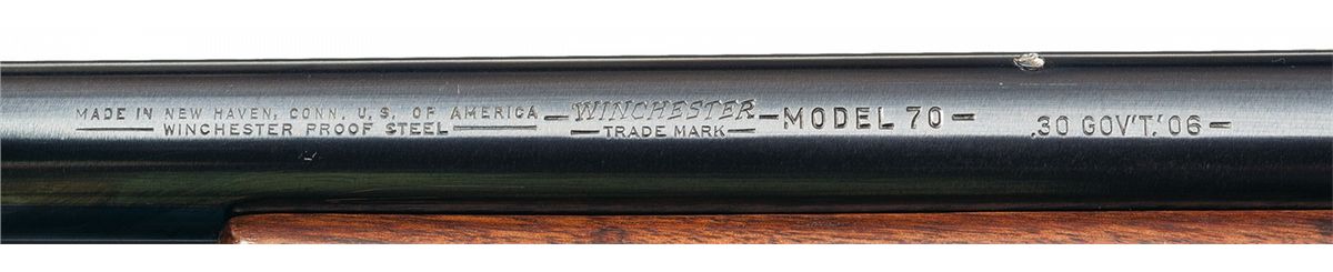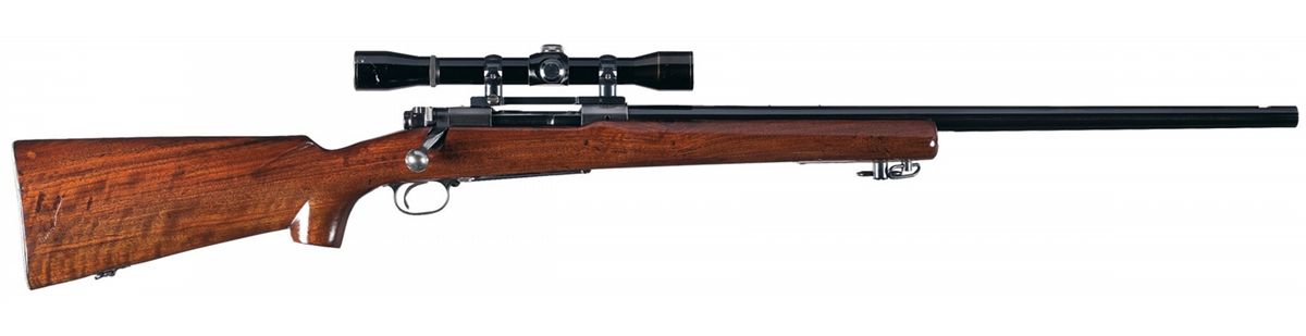 Manufactured in 1950, there is an open dovetail near the muzzle end of the heavy barrel with two holes drilled and tapped with filler screws near the breech end and marked with the 3rd style marking and ".30 GOV'T.' 06". "Late" type safety and solid bolt knob. The straight tang receiver has a clip feeding slot and is drilled and tapped on top of the bridges and on the left rear side for sight/scope mounting with a one-piece Redfield base and a Lyman All-American 4x scope with rubber lens cover. Mounted on a smooth Marksman style walnut stock with front accessory rail with two sling swivels, a rear sling swivel and a checkered steel buttplate.