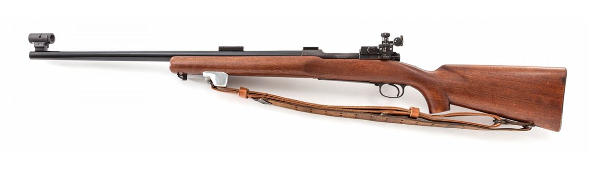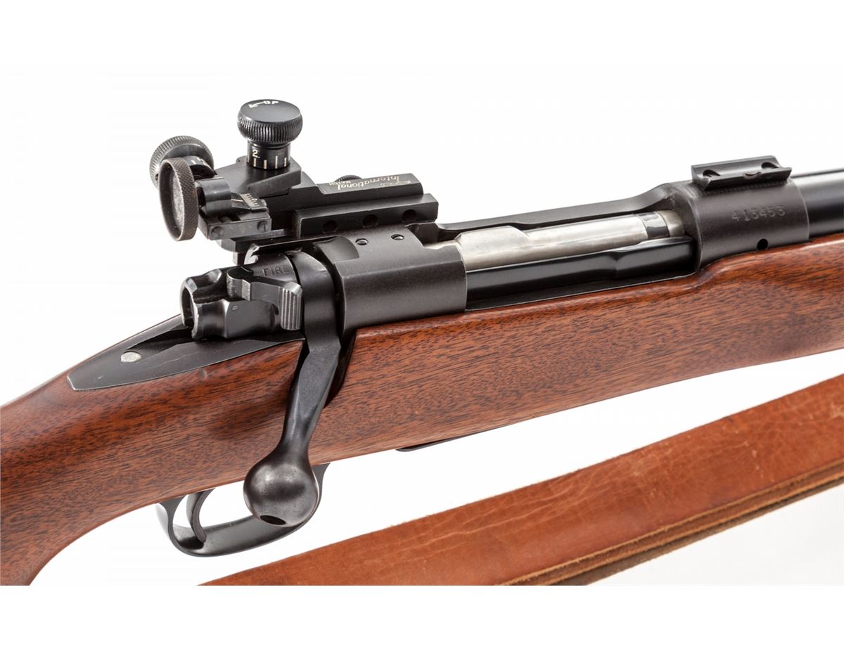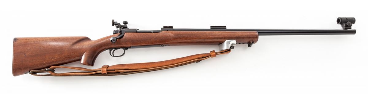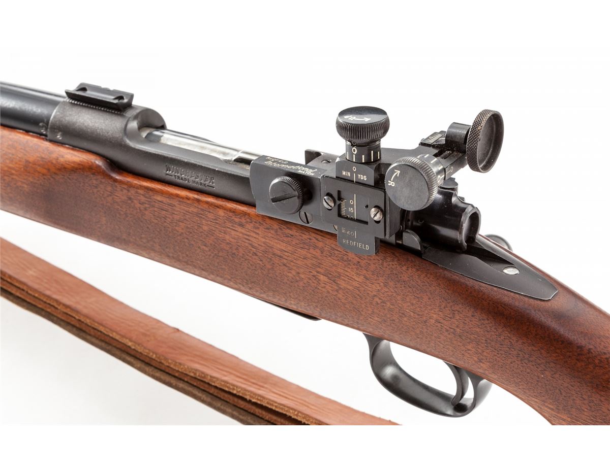 Pre-64 Winchester Model 70 Bolt Action Target Rifle, #413453, .30-06 cal., 24'' medium-weight barrel, blue finish, walnut stock, with Redfield International globe front sight, and Redfield International Match rear sight. Rifle additionally features dovetail scope mounts, with leather sling and adjustable handstop; original checkered steel buttplate is retained. Mfg'd 1957. Condition is excellent showing only light range use. Action is crisp, bore is bright. Est.: $800-$1,200. (C&R)