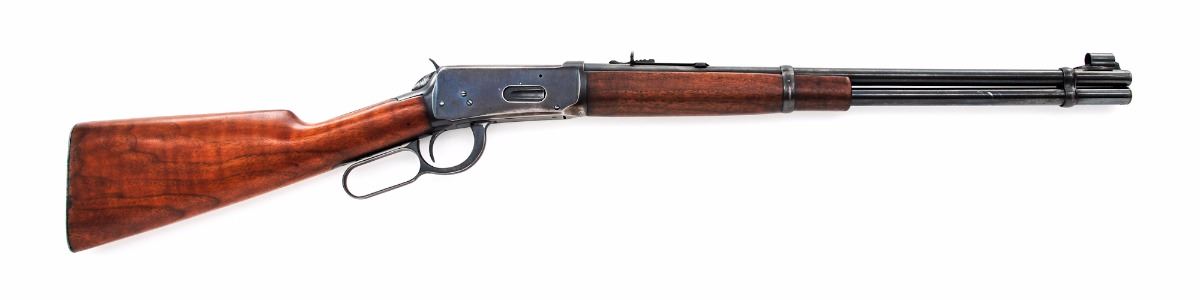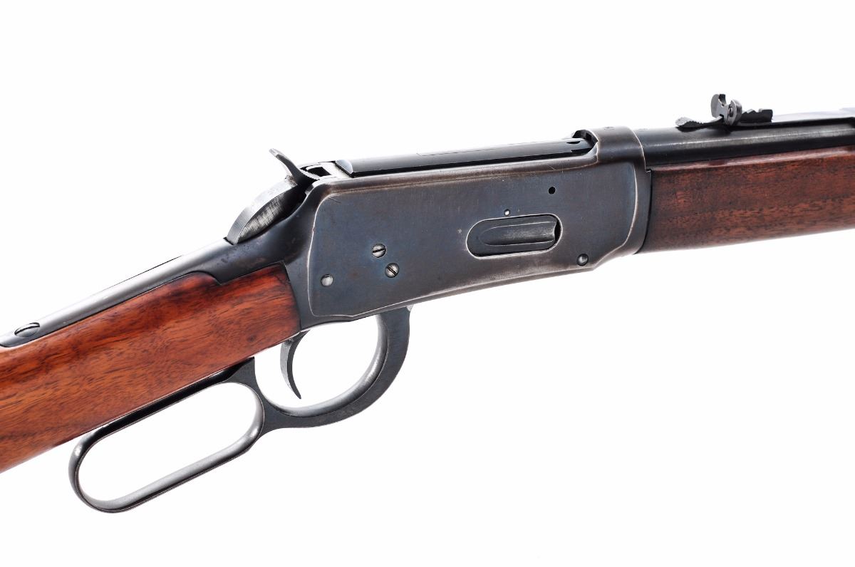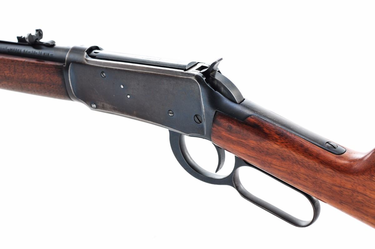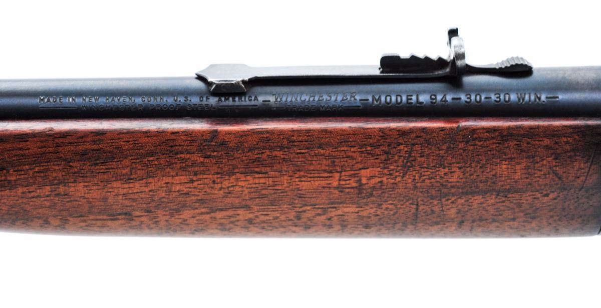 Pre-64 Winchester Model 94 Lever Action Rifle, #1711512, .30-30 cal., 20'' round barrel, blue finish, straight walnut stock and forend, checkered steel buttplate, hooded front sight and buckhorn rear sight. Mfg'd 1950. Condition is very good retaining approx. 80% blue with most of the losses at bottom and top edges of receiver. Barrel and mag tube with scattered red oxidation. Buttstock appears to have been refinished at some point, as the color does not match the forend. Action is crisp, bore is near excellent. Est.: $400-$600. (C&R)