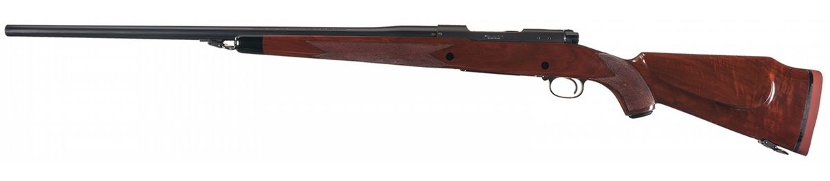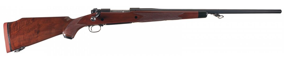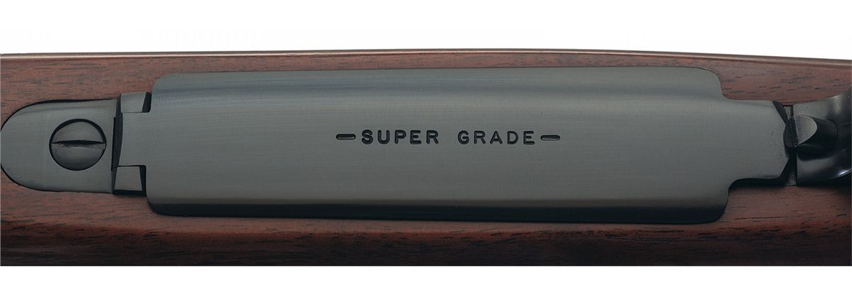 Manufactured in 1956. The barrel is manufactured without sights and marked with the Winchester legend on the left side. Winchester factory oval proof on the receiver and barrel and floor plate marked "-SUPER GRADE-". Receiver tapped for scope/sight mounting, straight receiver tang, bolt numbered to gun and quick release sling swivels. Jeweled bolt, extractor and follower. The checkered high comb pistol grip stock features a cheekpiece, ebony forend tip, hard rubber Winchester grip cap and solid Winchester recoil pad.