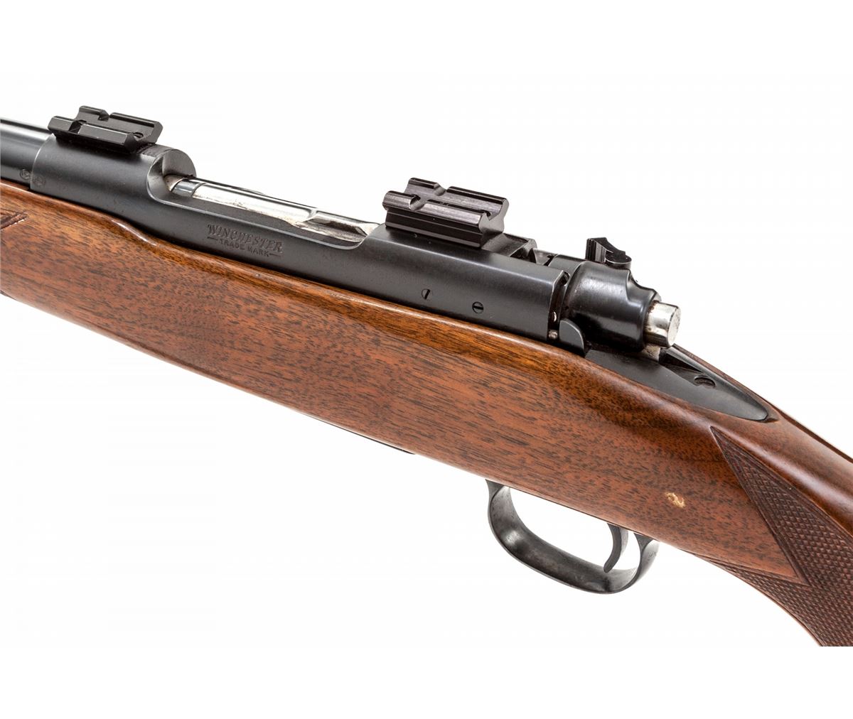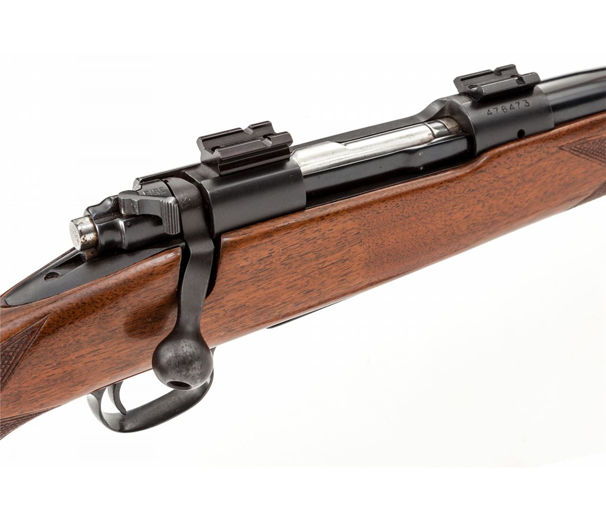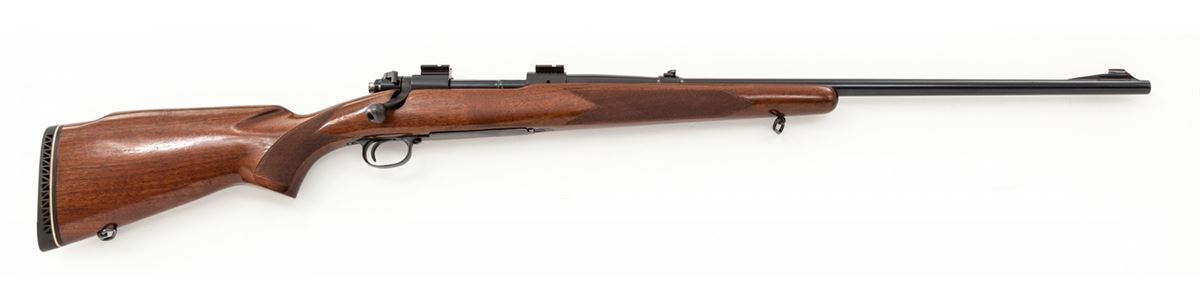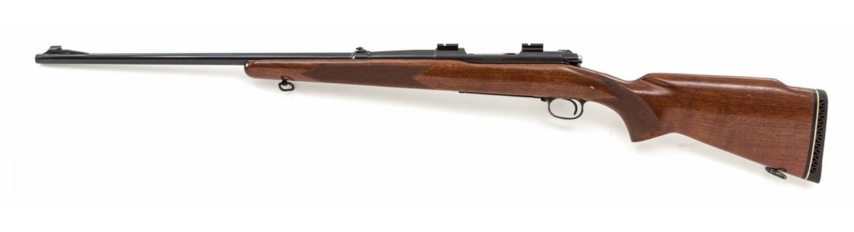 Pre-64 Winchester Model 70 Bolt Action Rifle, #476473, .308 Norma magnum cal., 24'' barrel, blue finish, factory checkered walnut stock, with later added Whiteline black butt pad. Topped with Weaver No. 46 & 47 scope bases. Originally mfg'd in 1960. Condition is excellent as converted to .308 Norma magnum. Barrel has been refinished at time of conversion. Stock with light marks from handling. Action is crisp, bore is bright. Est.: $450-$600. (C&R)
