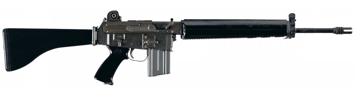 Manufactured by Armalite in Costa Mesa, California. This rifle uses a gas operated, piston driven system similar to the FN/FAL rifles. Reliable and robust, intended as an improvement over the standard M-16 gas system. Adjustable post front and flip up peep rear sights, prong flash hider and bayonet lug with an ambidextrous safety selector. "AR-18/ARMALITE" is marked on the pistol grip. Ribbed and ventilated forearm, smooth pistol grip and original Armalite folding buttstock with ribbed buttplate. Black metal web sling on the front sling swivel and on the bottom of the pistol grip. Complete with manual